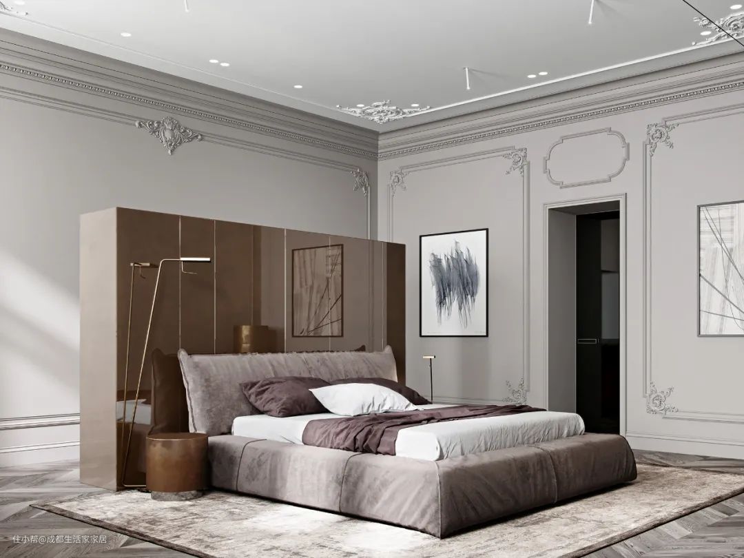 主卧室的布艺以豆沙色为主,高贵优雅。居中放置的床体后方是梳妆的空间,在整个空间里形成一个简约的回字形动线。