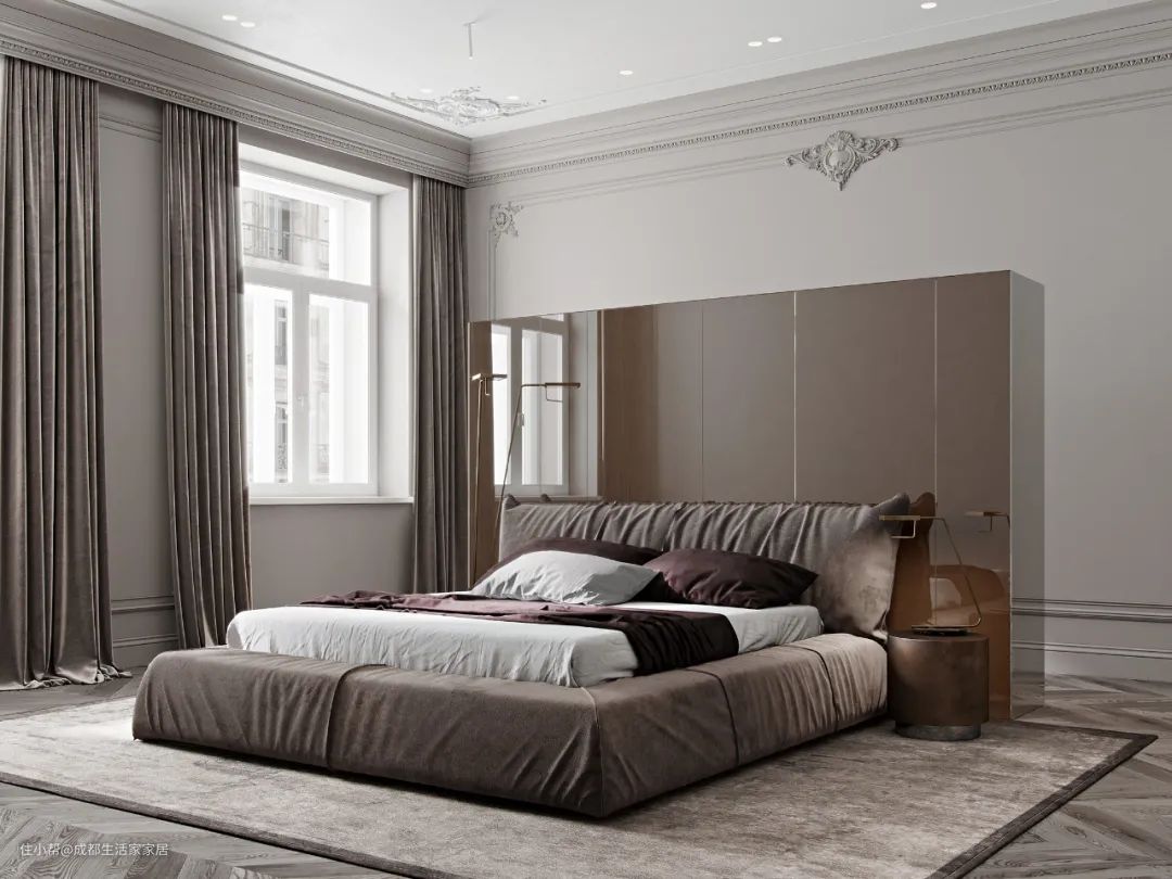 主卧室的设计保留了古典主义的线条,所有色调与家具尽可能显得轻盈,床头背景的浅珊瑚色衬托得空间温暖恬静。