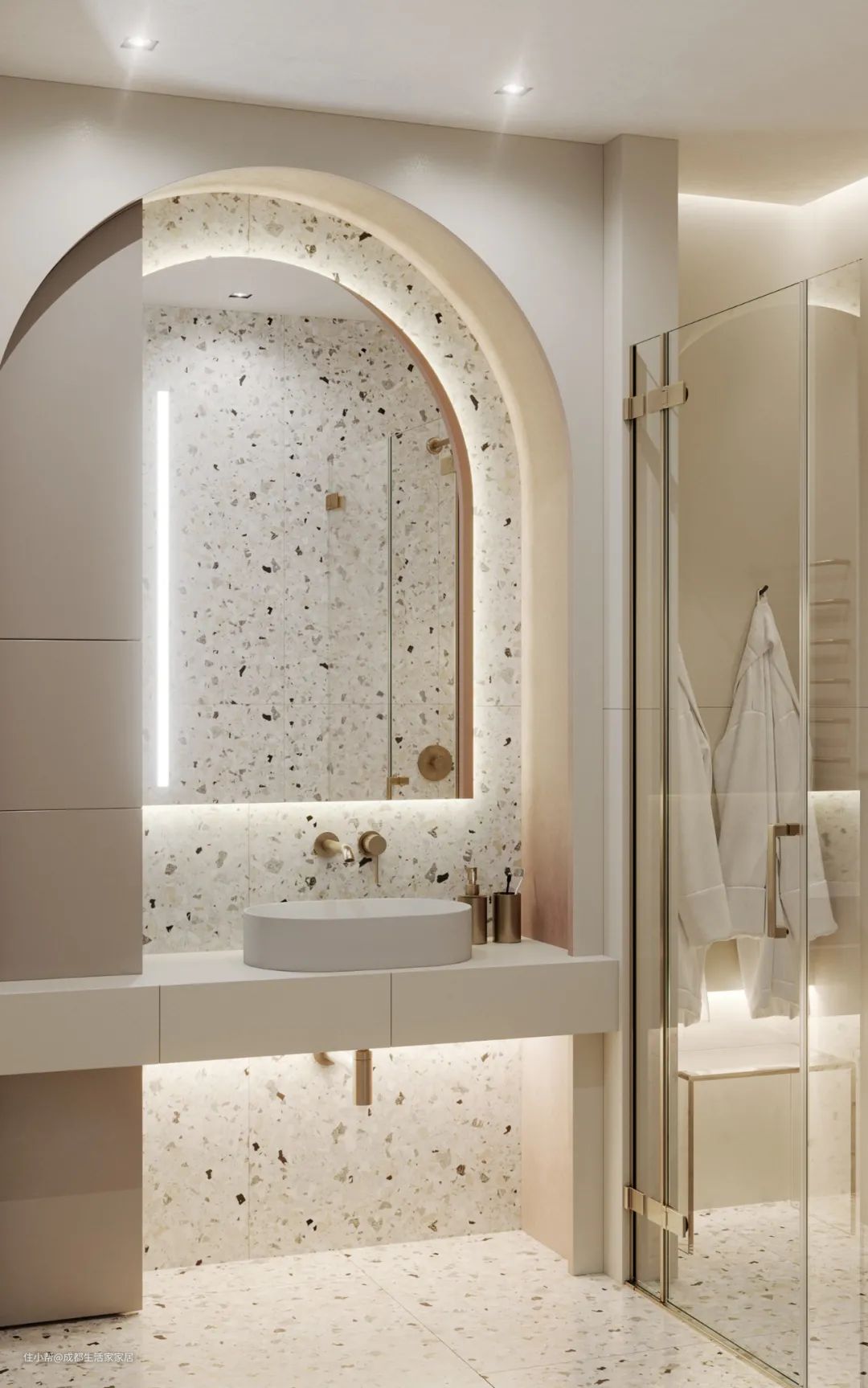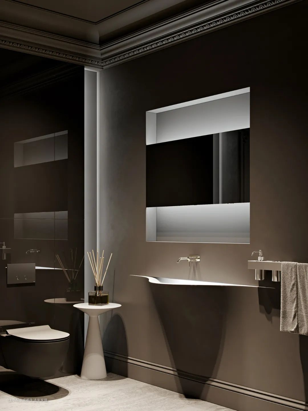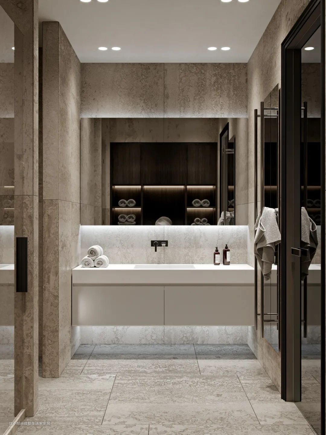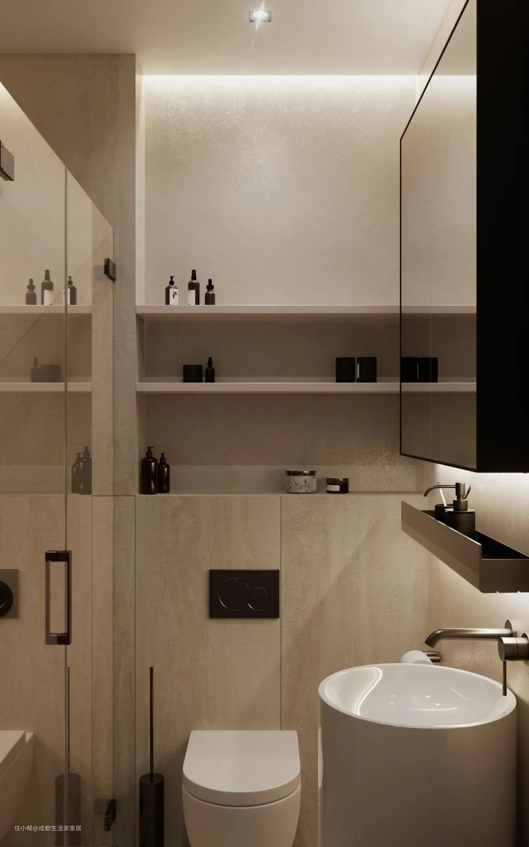 公卫是三分离的设计,日常使用更加方便,马桶区域还设计有单独的洗手池,造型仿佛破墙而出,极具设计感。