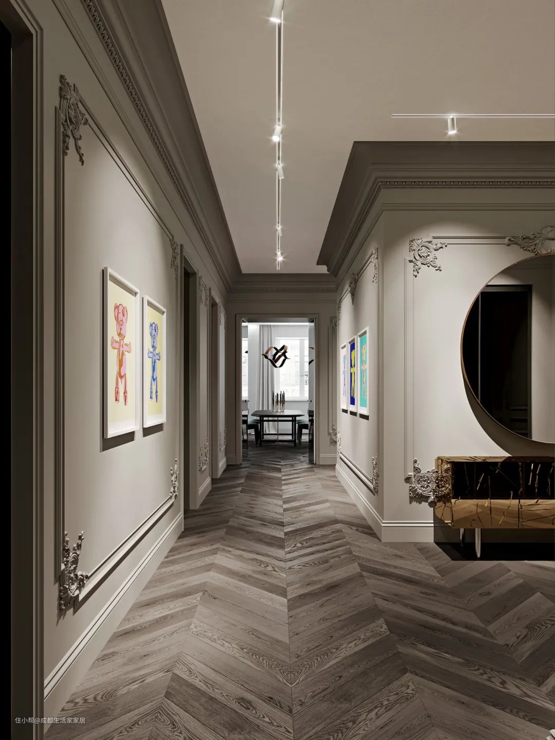 走廊内利用墙面凹陷设计了可供欣赏的艺术装置,顶面的磁吸轨道灯光源位置可以随时调节,根据不同的空间情景调节出不同的灯光氛围。