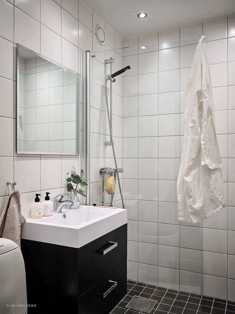 卫生间是传统的方形黑白砖搭配,空间明亮,线条简洁。