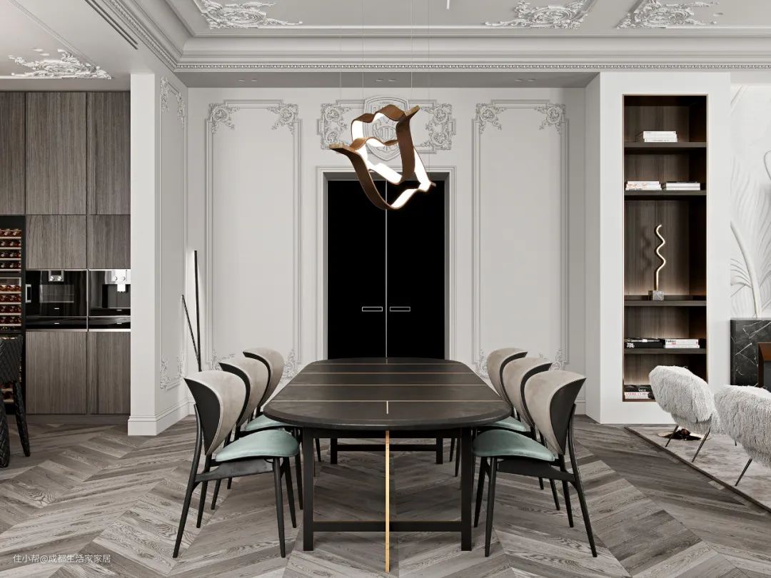 高贵典雅的古典艺术与现代性交织在一起,奠定了空间精致、内敛的格调,有气质的灰色墙面在石膏造型的点缀下营造出高贵的风格,现代风的简约家具设计散发出理性的空间形态。