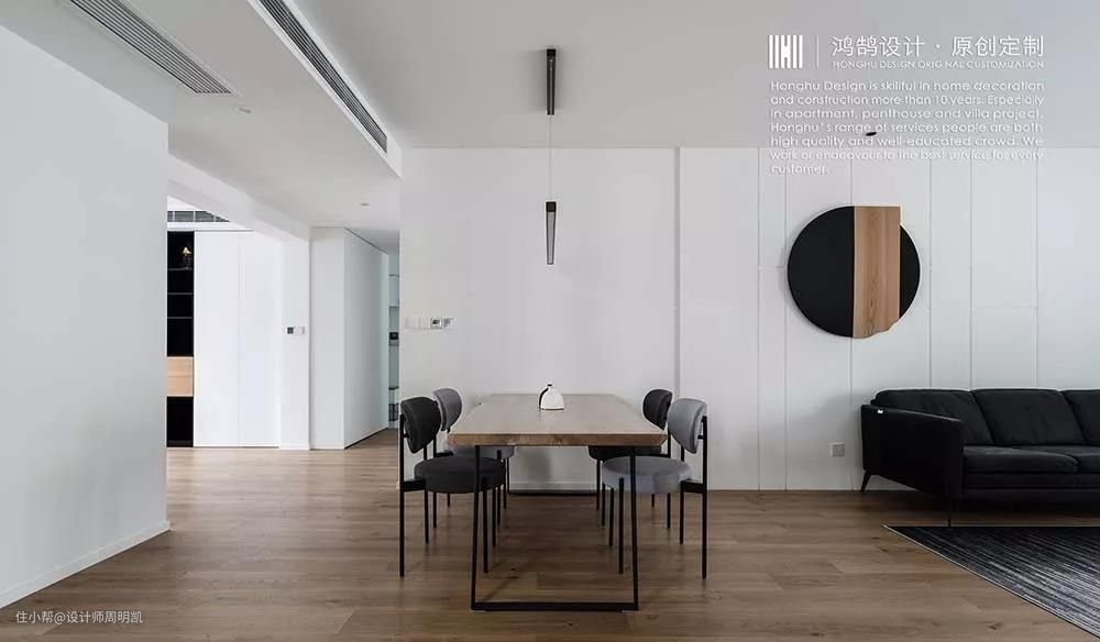 3. 餐桌靠近走廊的一边,与走廊平行,同时通过桌椅的设计,以及灯具的搭配,给予纵向空间一份和谐统一的整体设计。