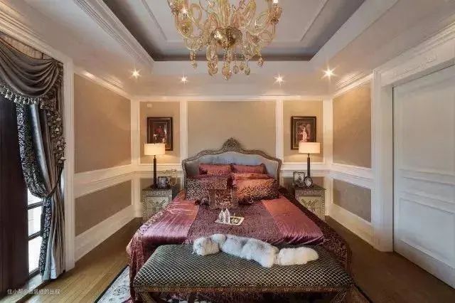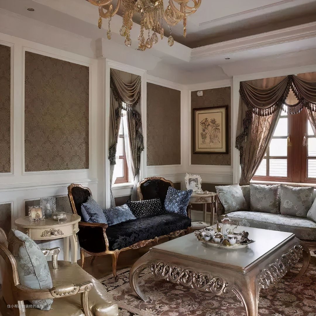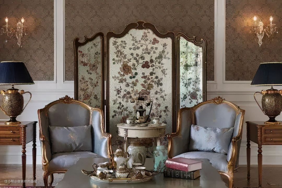 洛可可风格中,水晶吊灯、金箔、铁艺、墙布、地毯、天然石材等元素,都是十分精致细美的。