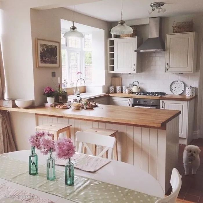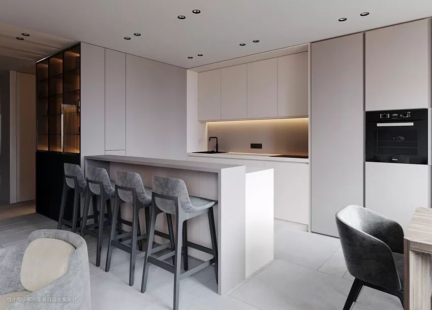 在厨房留出一小块空间,设置一张吧台,在家就能体验酒吧、咖啡厅和茶舍,压根不用去排队打卡网红店。