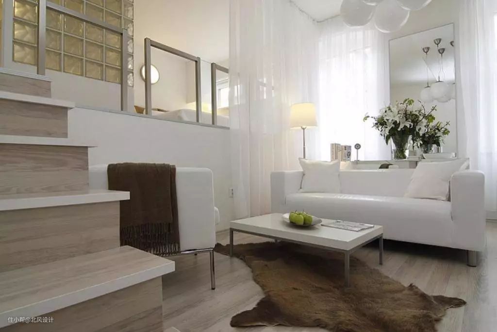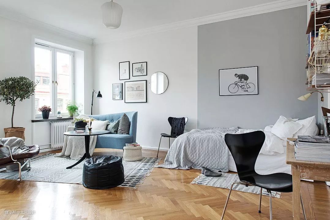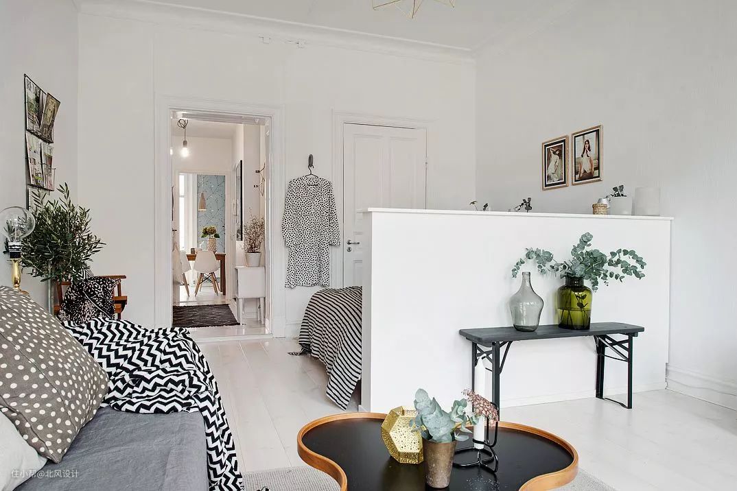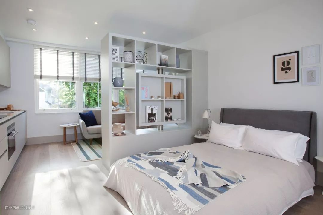 这是另一个半面墙的想法。如果你想让你的空间保持明亮和开放,这是一个很好的选择。有了半面墙,你可以将空间划分成特定用途的区域,比如这里的客厅和卧室。顺便,靠床的半墙解决了床头柜的问题。