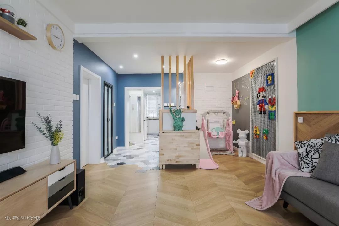 在木地板的同时,再加入大面积的木质感墙面,让空间被自然舒适的原木风包围,呈现出一种自然轻松的舒适氛围。