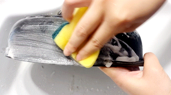 再来看锅底的顽固锈渍,用力来回擦拭几下后,用水一冲也是干干净净了。