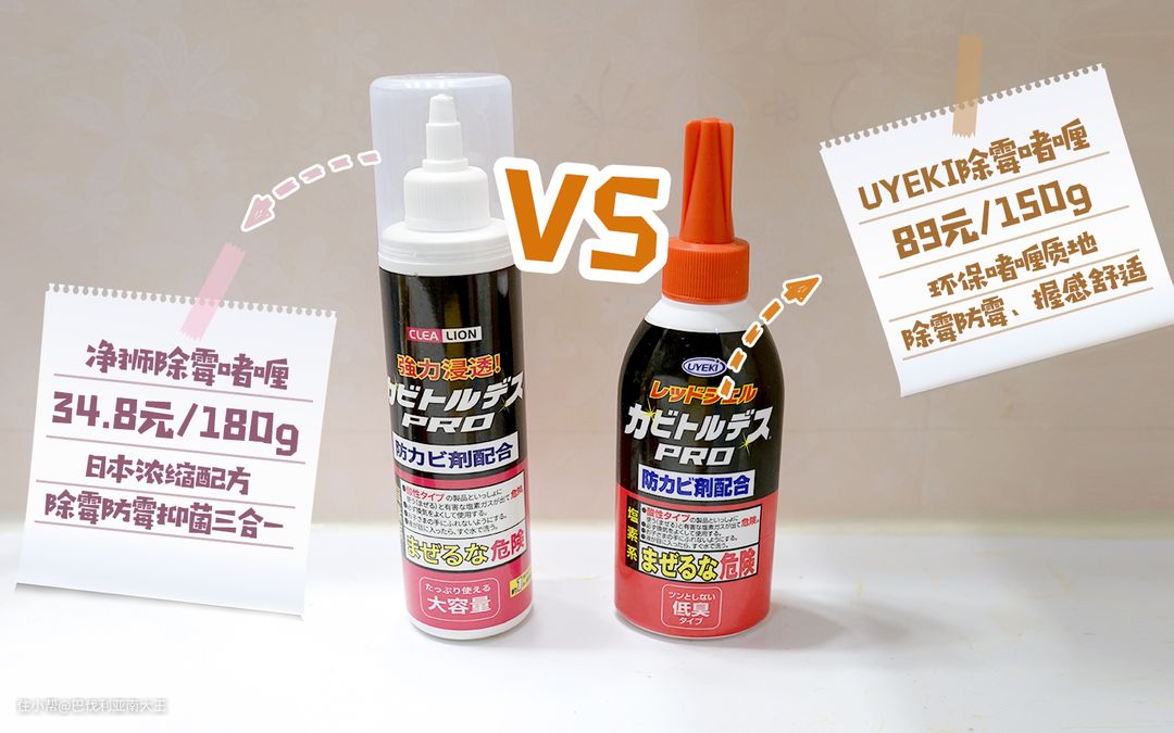 除霉啫喱也是家家必备了,比起刚才说的清洁乳,它小巧便携,可以更有针对性的快速渗透除霉,立竿见影!推荐左边这款净狮除霉啫喱,效果和成分都和右边那款在日本大火的UYEKI墙面缝隙去霉剂一样,但价格便宜非常多!
