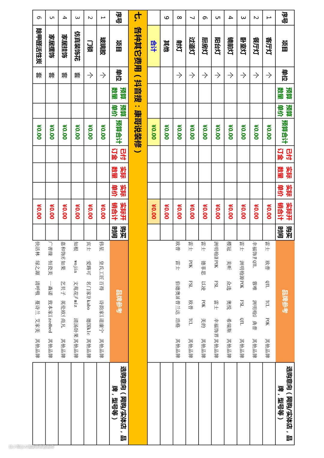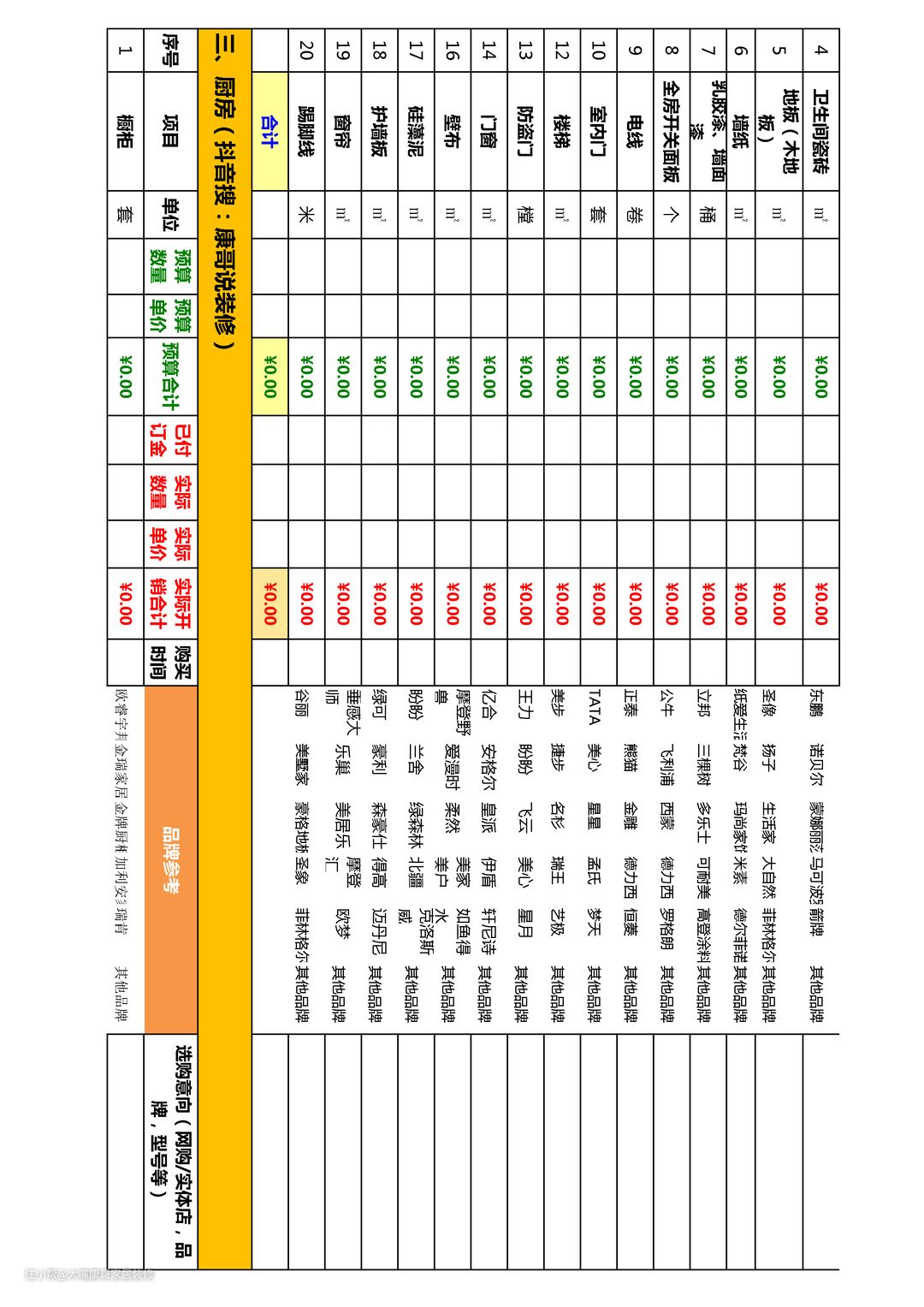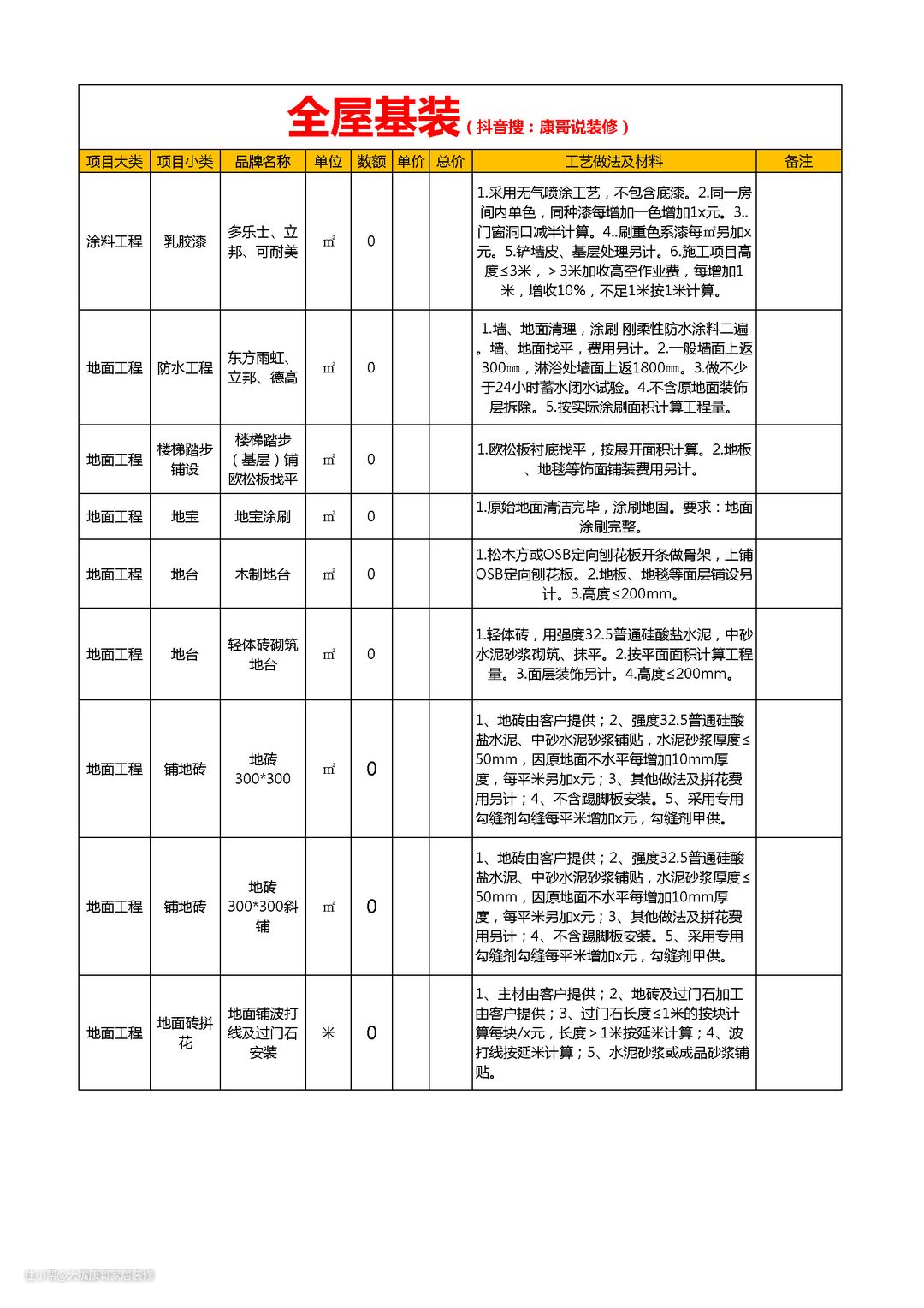 装修预算表!大嘴康哥家居装修2021-04-17我敢说这套装修预算表是至今最全的。它分别是基装的387项,品牌主材104项,品牌家电48项,品牌家具24项。你只要填进去价格,能知道你家到底能花多少票票。
