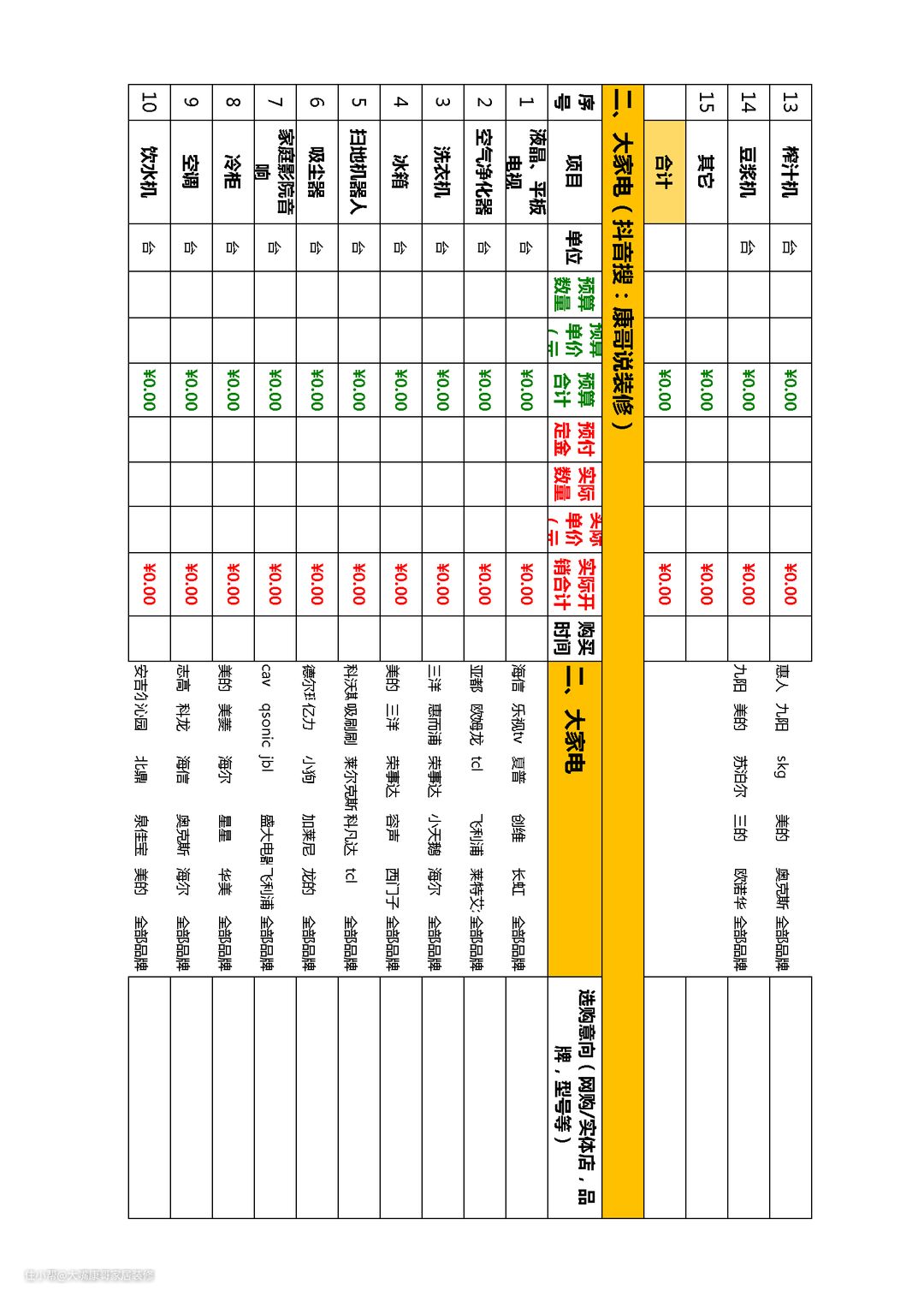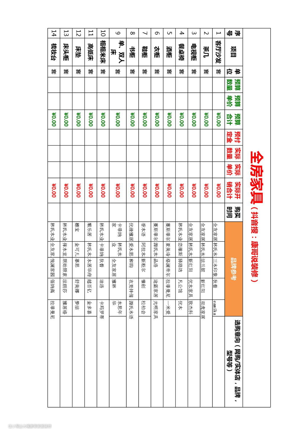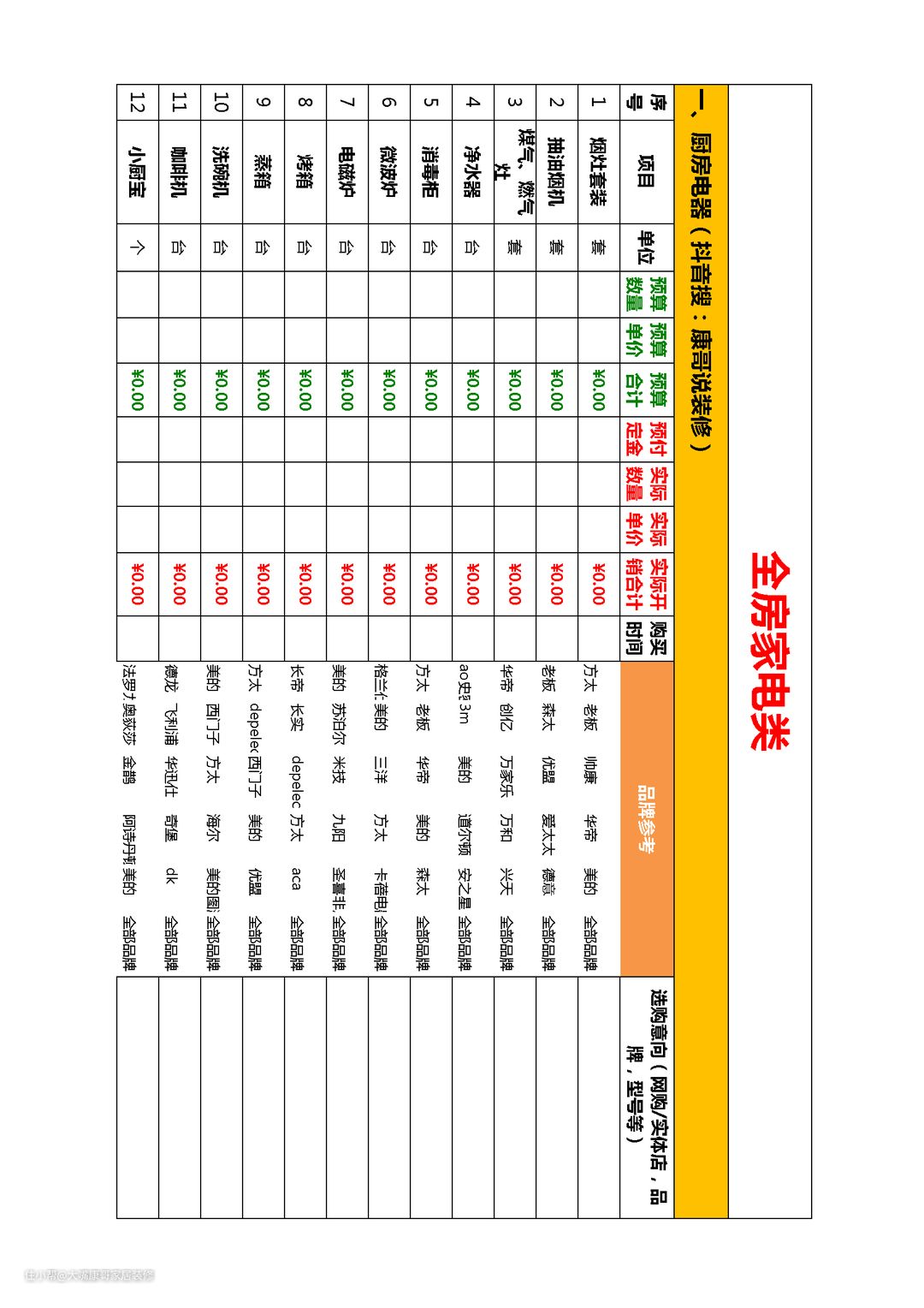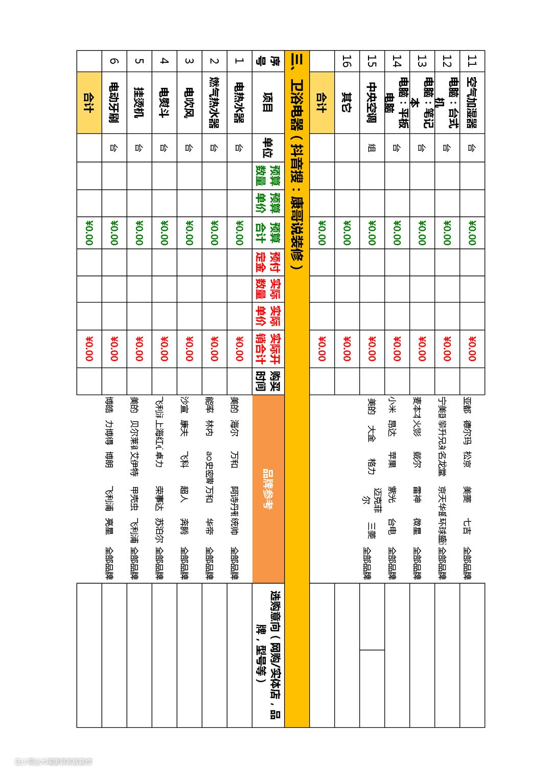 装修预算表!大嘴康哥家居装修2021-04-17我敢说这套装修预算表是至今最全的。它分别是基装的387项,品牌主材104项,品牌家电48项,品牌家具24项。你只要填进去价格,能知道你家到底能花多少票票。