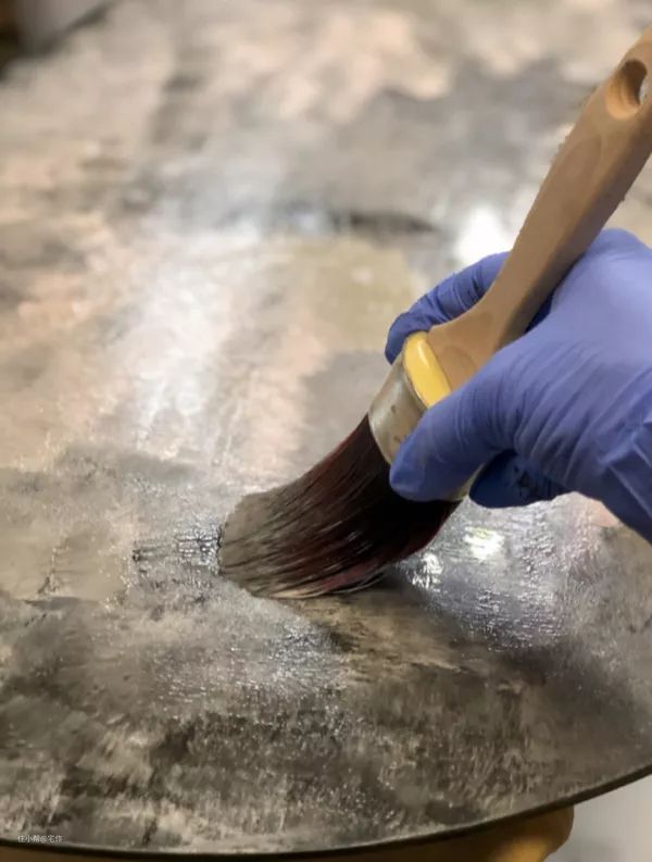 在镜子的背面用平底刷将油漆刷了上去粉质矿物漆。