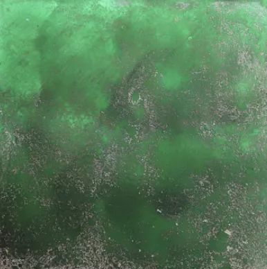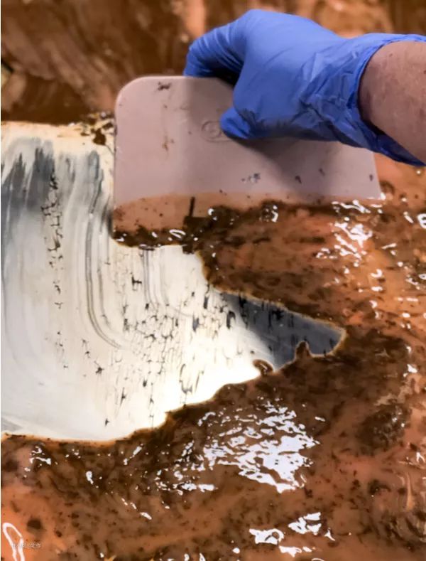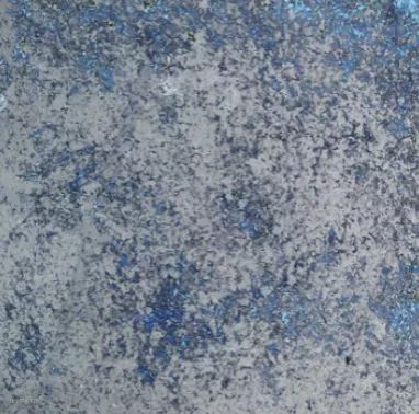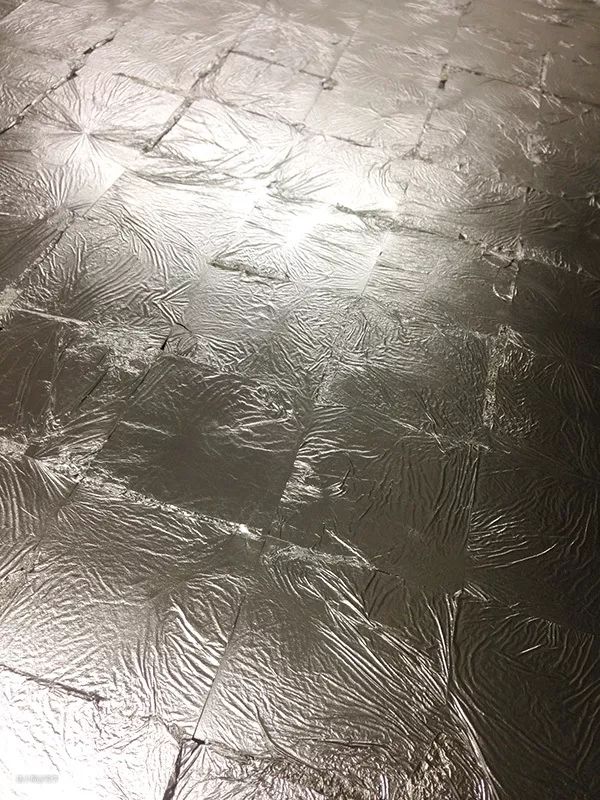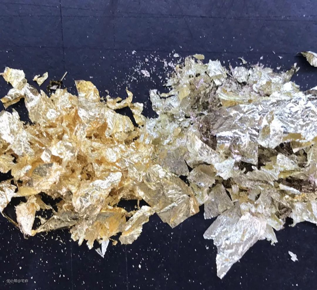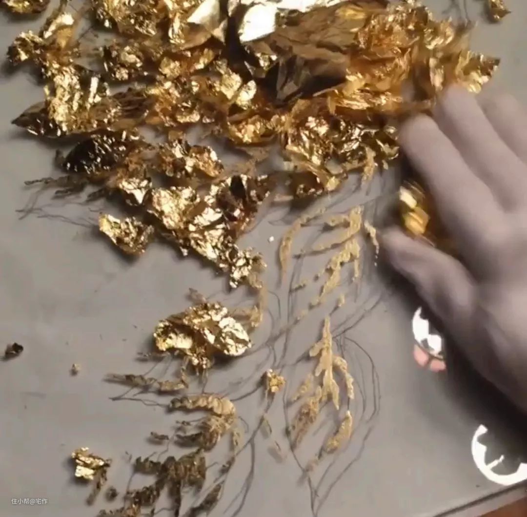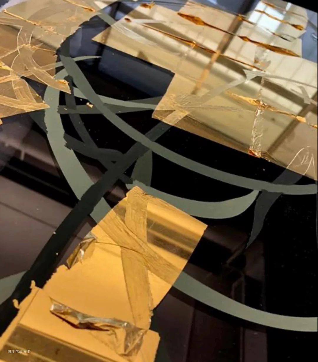 d. 将碎片状金属箔洒在已经用胶水绘制好的玻璃饰面上,然后用手来回波动金属箔,最后留下金属色的图案。