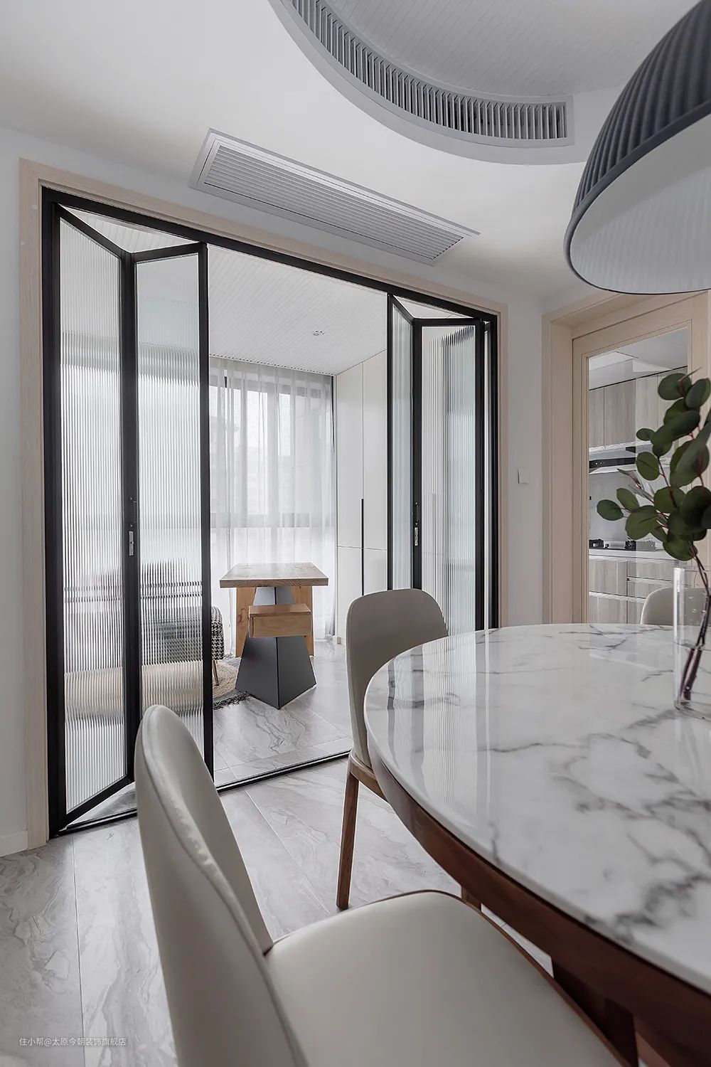 折叠门划分出一个独立的餐厅空间,既可以让用餐更加具有仪式感,也使餐厅功能更加明确,更加独立,丰富餐厅层次感和设计感。