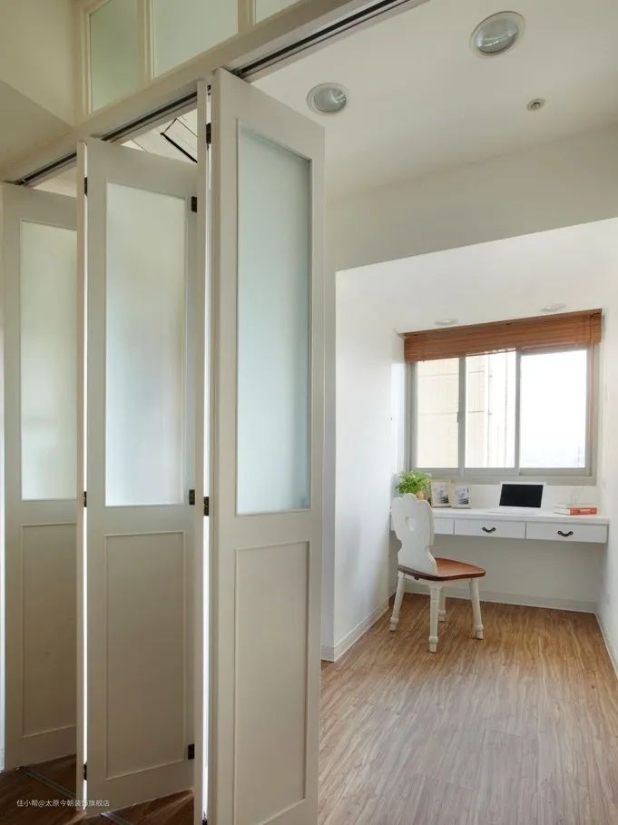 如果书房的使用频率不高,只是作为辅助功能区使用的话,就可以利用折叠门将书房和其他空间打通使用,在无人使用书房时,将折叠门打开,把书房空间纳入公共区域,让家里看起来更加宽敞。