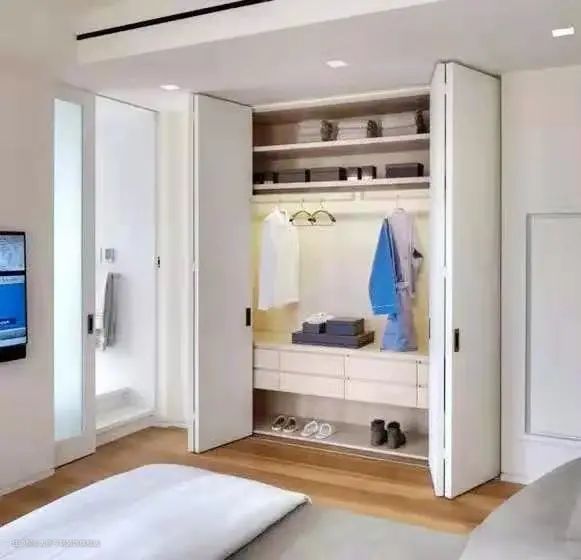 折叠式柜门可以为本就不大的空间带来更多的可能性,而且视觉效果比平开式衣柜门更加宽敞,如果衣柜空间大一点,也会有种变身衣帽间的即视感。