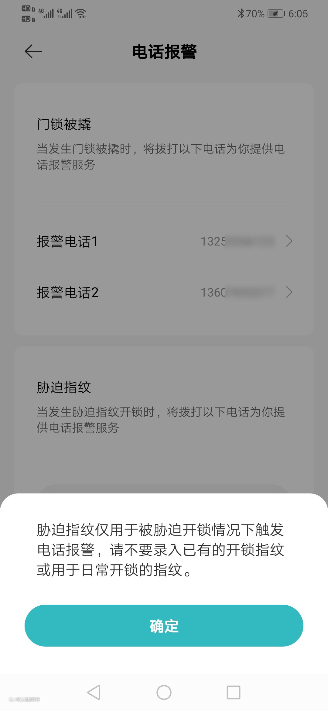 设置路径:设置——门锁设置——实验室——电话报警——门锁被撬/胁迫指纹
