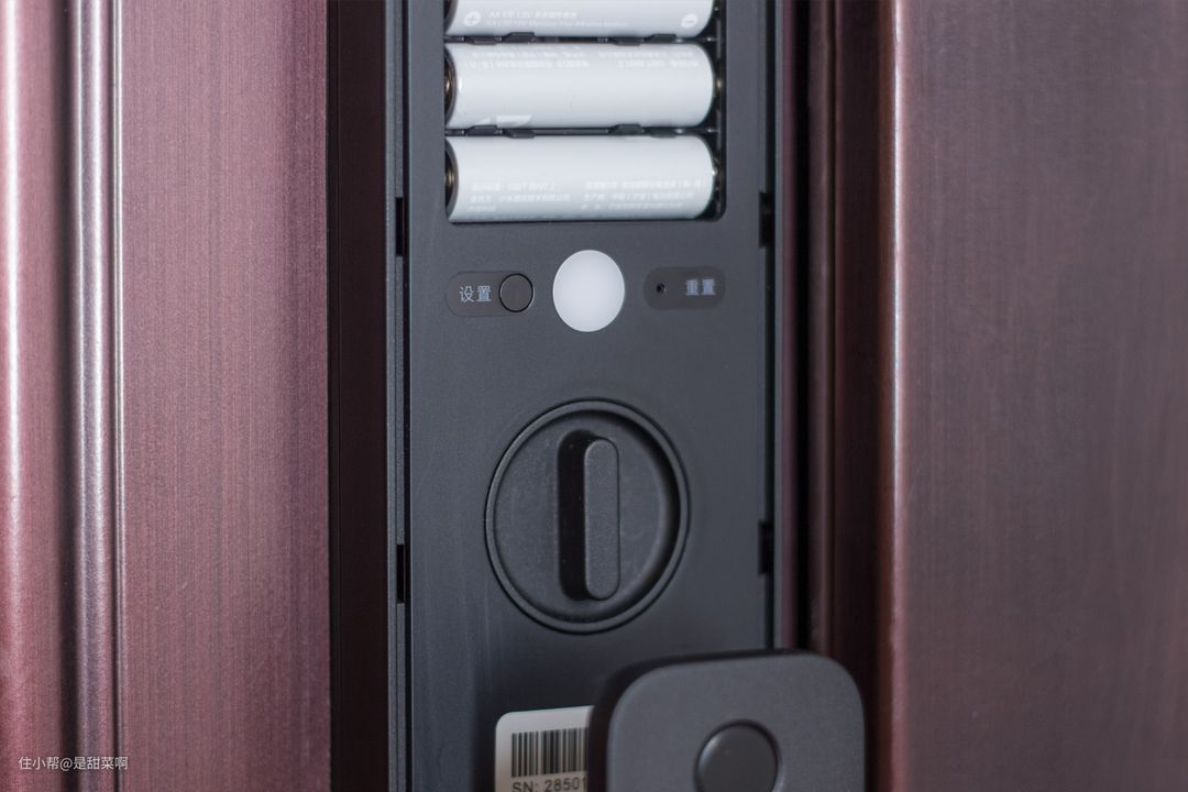 电池下面的两个按钮,左边的设置键长按三秒可以和手机蓝牙配对,如果不方便使用手机,短按设置键,进入本地设置模式,即可在门外进行添加指纹和密码的操作;右边重置键可以一键恢复到出厂设置,属于备用键,不太常用到。