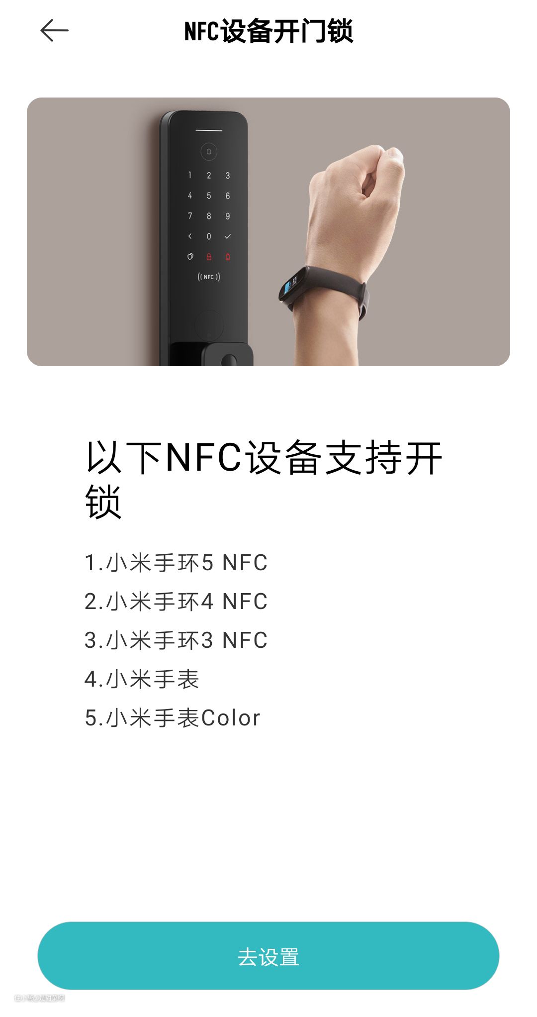 支持NFC开锁设备:小米手机MIX 2S、小米10/10 Pro/10青春版、小米CC9、小米9、小米6、红米K30/K30 Pro;小米手环3/4/5 NFC版;小米手表、小米手表Color。