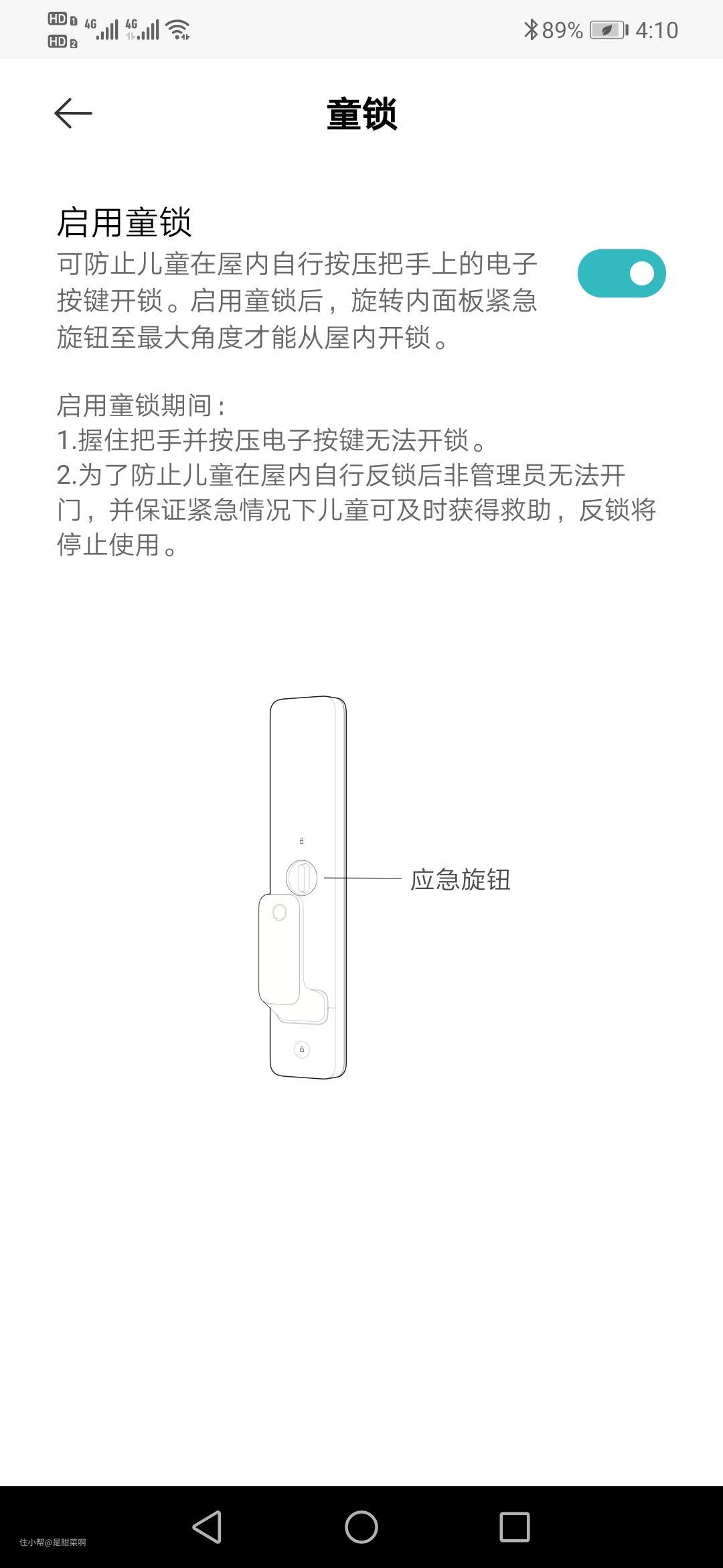 为了防止小孩子无意中开门,发生一些不可控的事件,只要在手机设置中打开童锁,常规的开门方式将不能使用,只有应急开锁旋钮旋转到最大角度才能手动开锁。