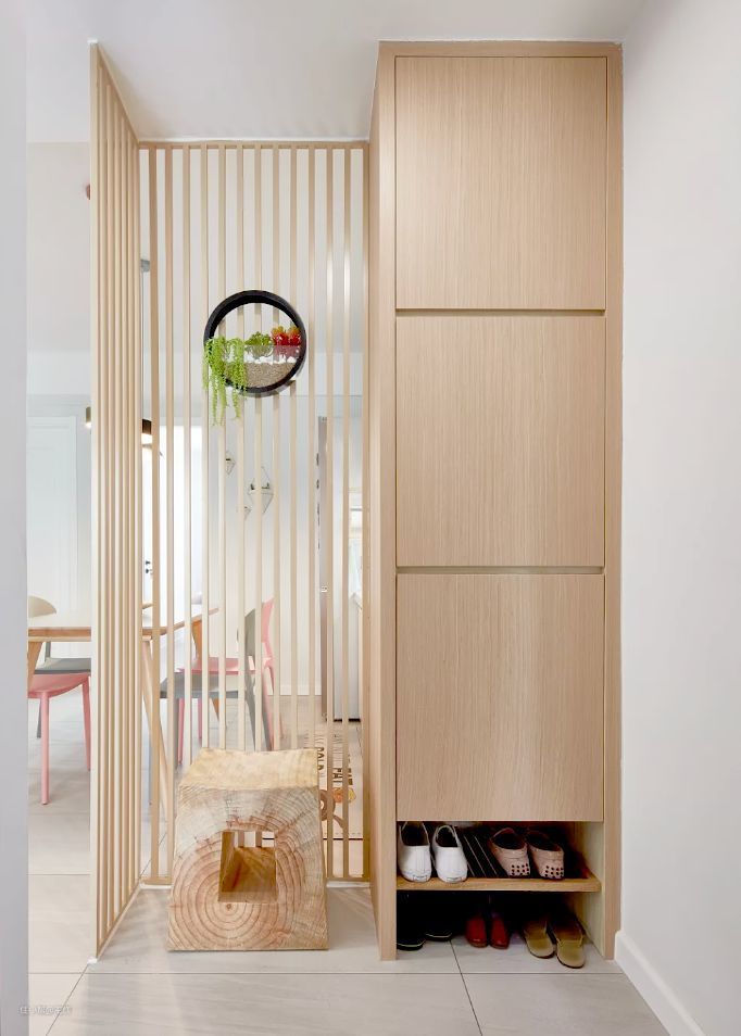 上半部分采用镂空隔断,最大化地保证空气流通;下半部分则利用收纳型柜体加以组合,既可起到基本的遮掩作用,又发挥了一定的收纳功能,让人一进门就体味到家的温馨。