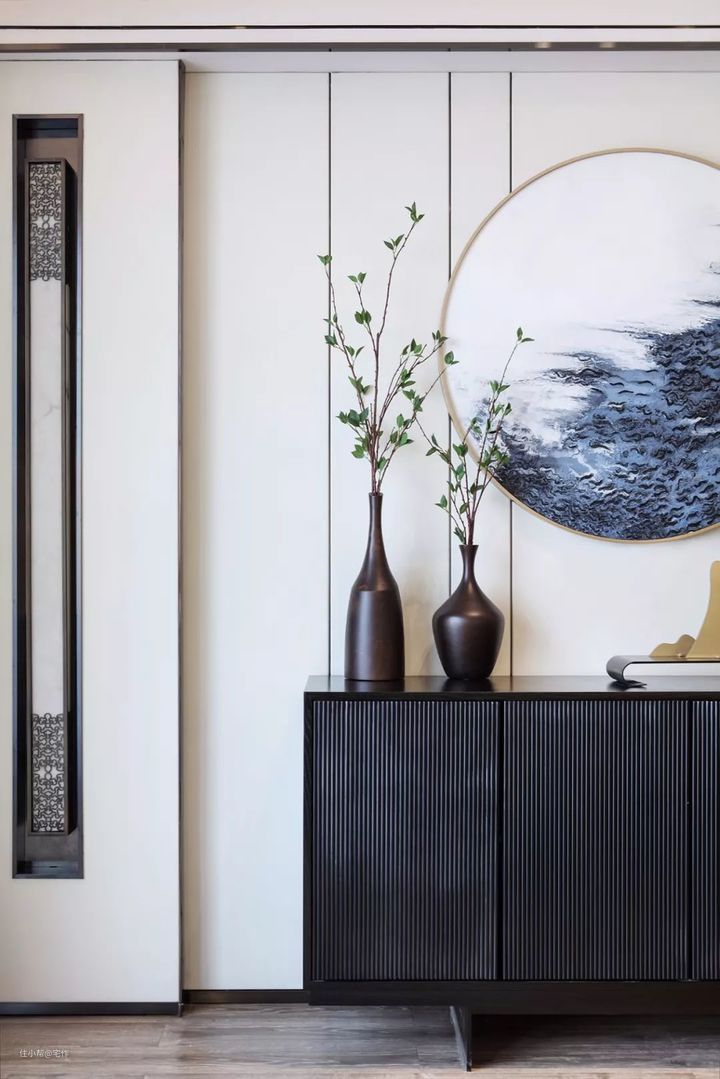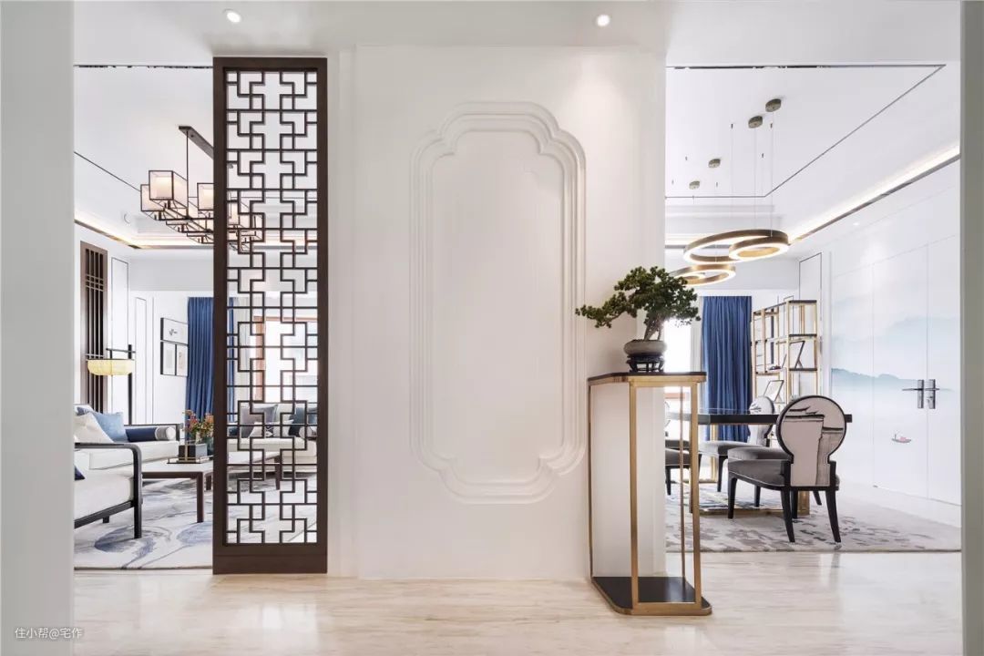 现如今,封闭式玄关墙在新中式风格中较为多见。不过,它在设计上已经摒弃了以往繁复的色彩与线条,而是追求“以简为美”,整体采用淡雅的色彩、简洁的线条来凸显家居质感,简约而不失精致,给人一种眼前一亮的感觉。