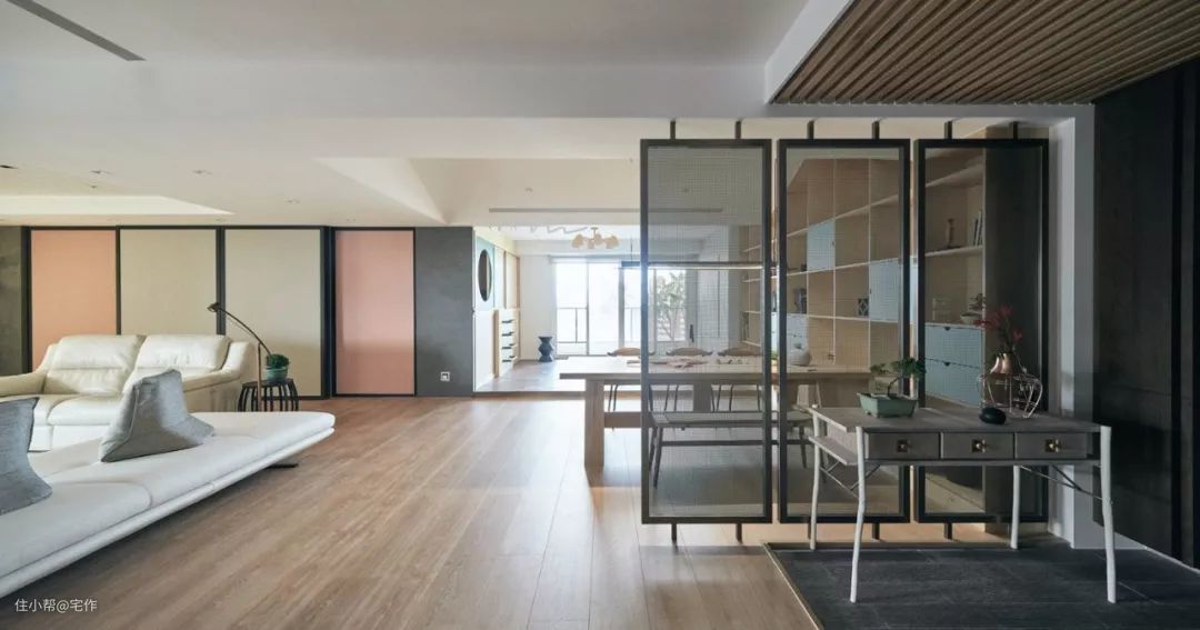 通透式玄关墙是空间的一大亮点,它的装饰性非常强,大多采用格栅、围屏、纱帘、镂空、半柜隔断等多样化的形式,来美化空间布局,提升整体的层次美感。