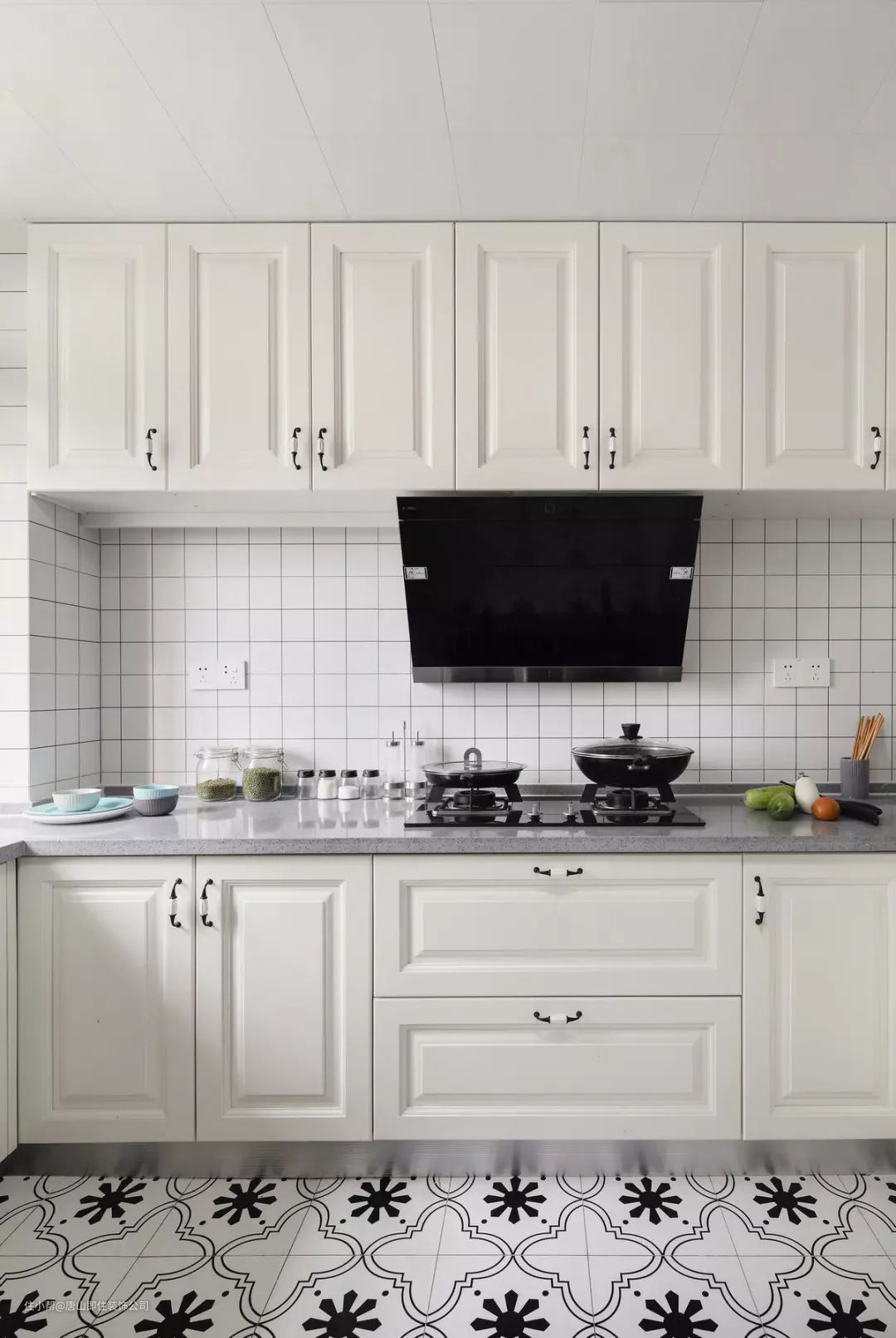 厨房内部的空间比较宽敞,橱柜是做了L型的布局,地面的黑白色花砖搭配白色的橱柜和墙面小白砖,再加上灰色的踢脚线和台面,黑白灰的经典搭配更显简约时尚。