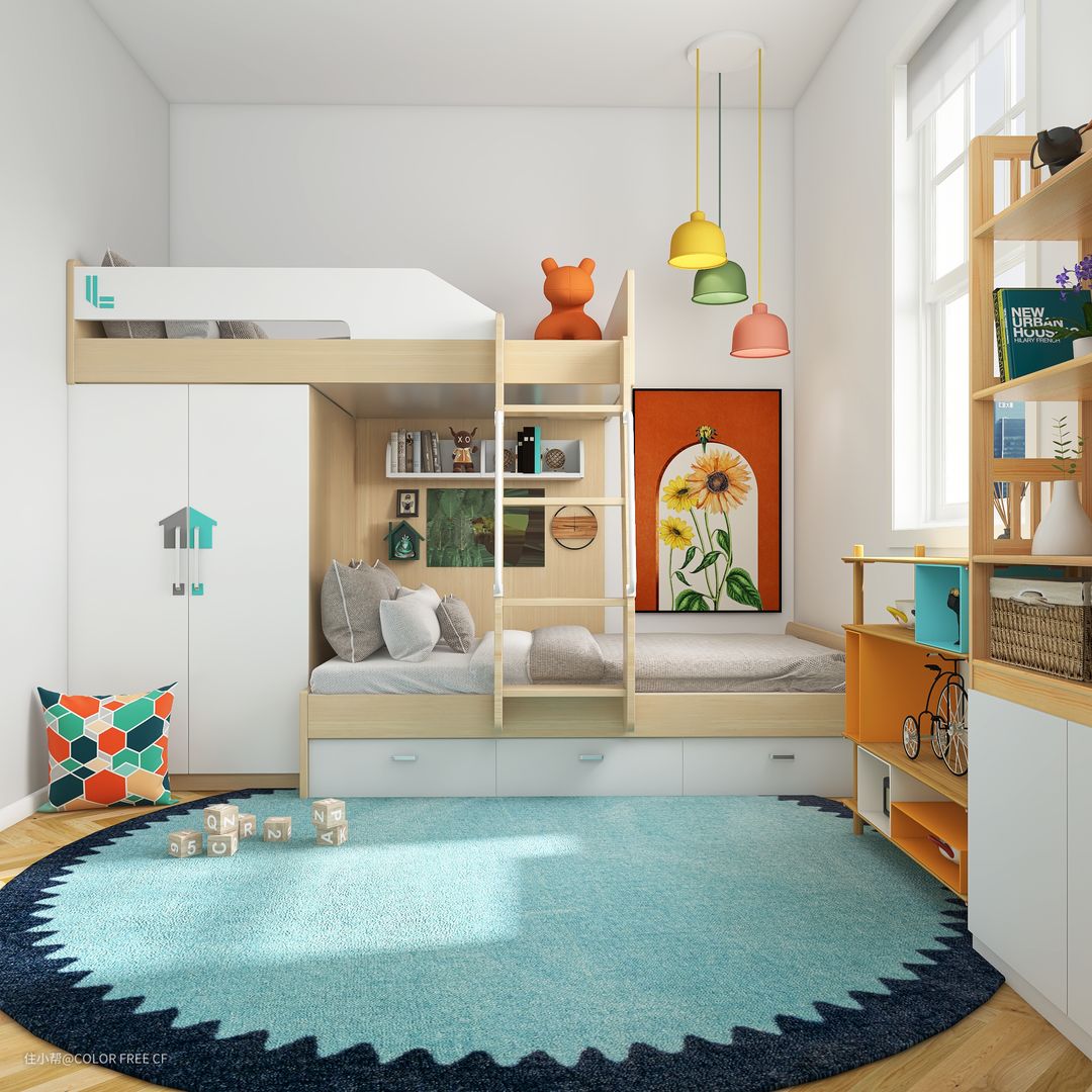 2、我们家儿童房只有5平米,一个衣柜一张床啥也放不下,但是这个交错式上下床完全打消了我的顾虑,两张床,一个大衣柜,下床还有超大的储物空间,床尾放个书桌书架,整个屋子还很宽敞