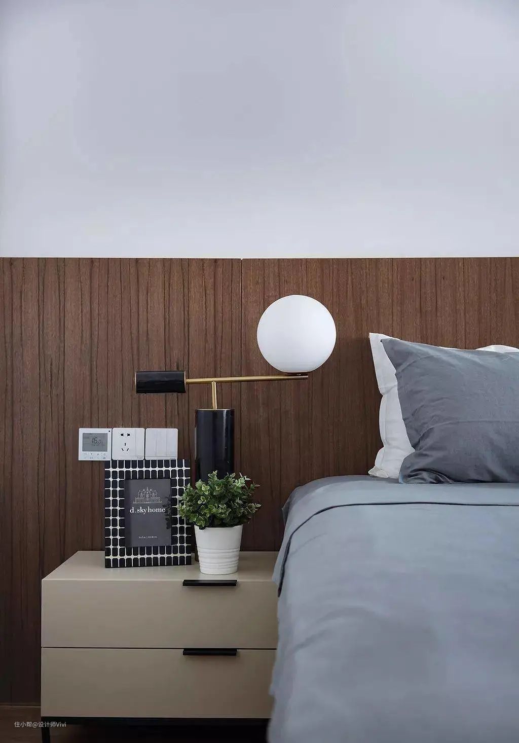半高的护墙板替代了床头,相比床靠视觉上更加大气、简洁一些。