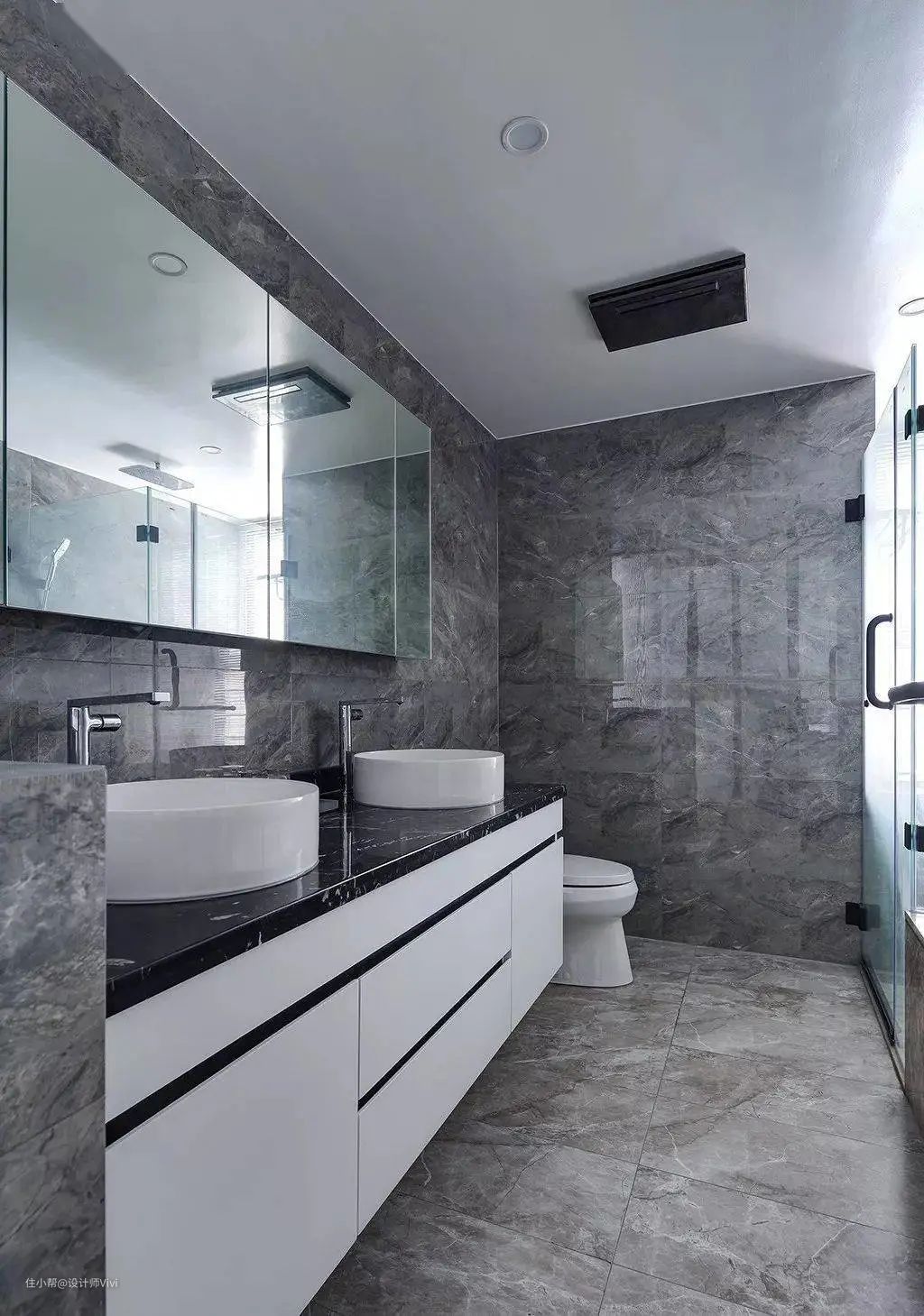 浅灰纹理瓷砖筑起了卫浴间了的主基调,黑色大理石台面搭配烤漆柜体的双盆洗手台,简洁素雅,呈现舒压干净的宁静之美。