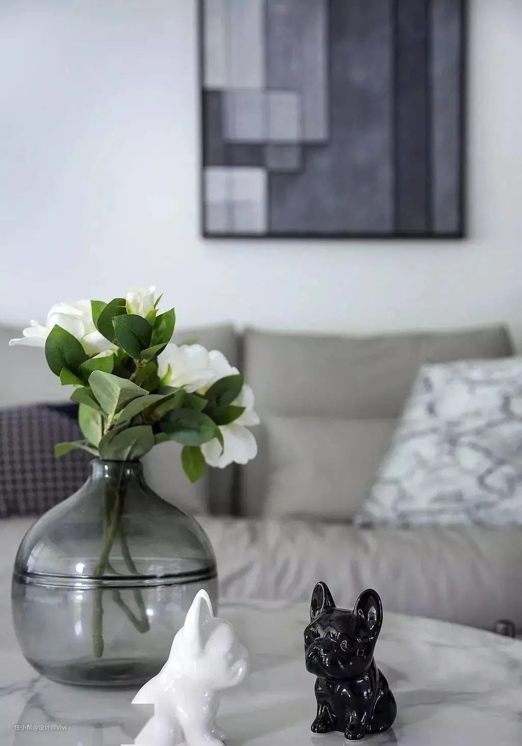 黑白组合式的大理石茶几,更显时尚及品位。花瓶里的栀子花,芳香了整个空间。可爱的黑白小狗,在细节上赋予变化增加趣味。