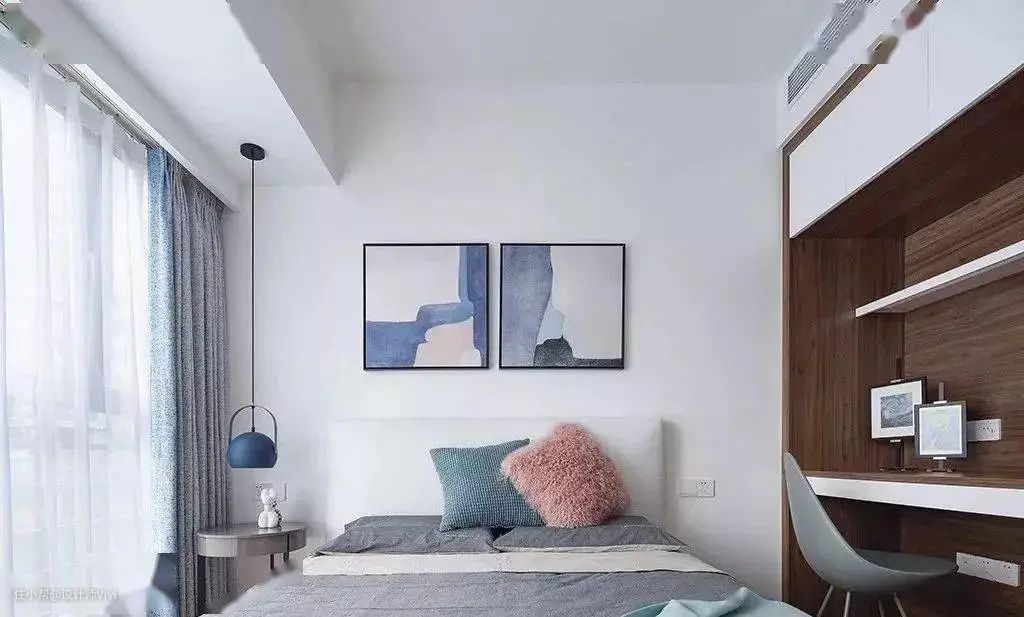 次卧的色调比较清新,灰白色的空间,加入了蓝色与绿色,彷佛隔绝了外界的纷繁嘈杂,可以放下心里的戒备,享受属于自己的一片安宁。