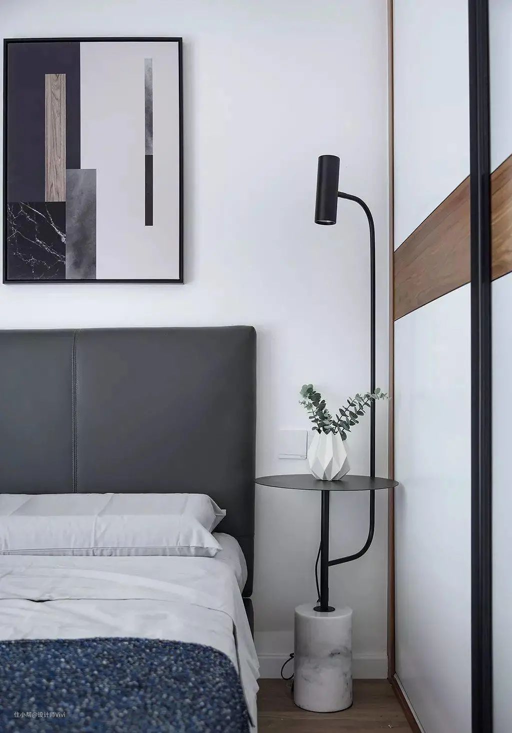 带台灯的边几替代床头柜,设计感与实用性都有了。一件好的单品也会为空间增分不少呢!