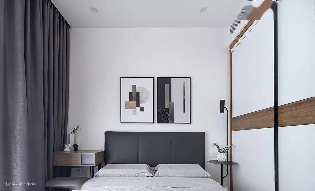 柔和的灯光,舒适的床品,只在角落随性摆放一些小摆件,床头挂上两幅艺术挂画,简洁纯粹。