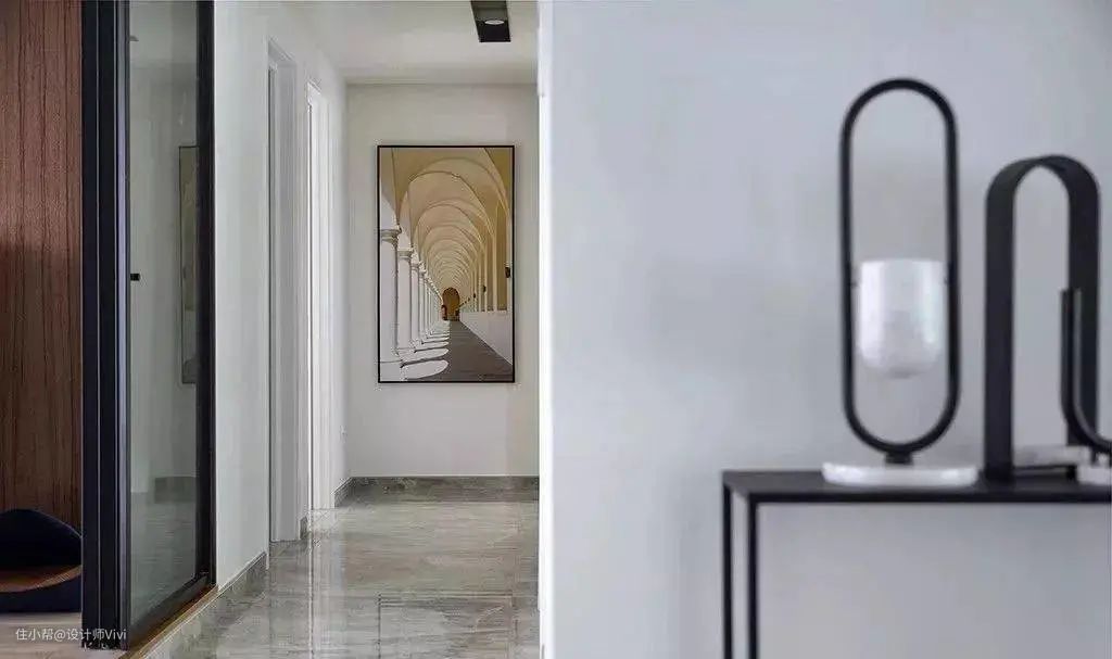 沿着过道走入深处,悬挂的色彩与环境极度契合的艺术挂画,视觉在画面上得到了伸展,意味深长。