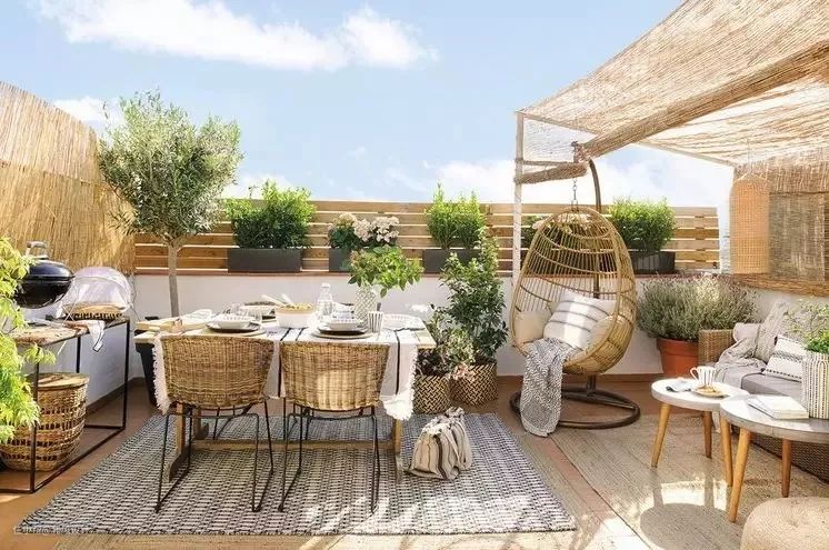 其实,户外家具选择防腐木、不锈钢和藤条类材质就可以啦。不单防裂性好,耐用性强,而且外观也非常漂亮,是理想的户外家具。另外,搭配具有储物功能的座椅,可以直接把软垫放入其中,避免了搬运。