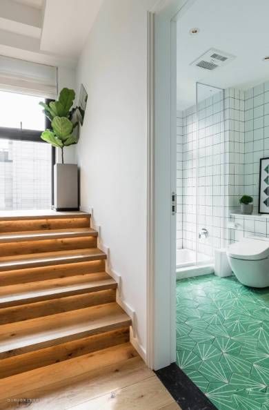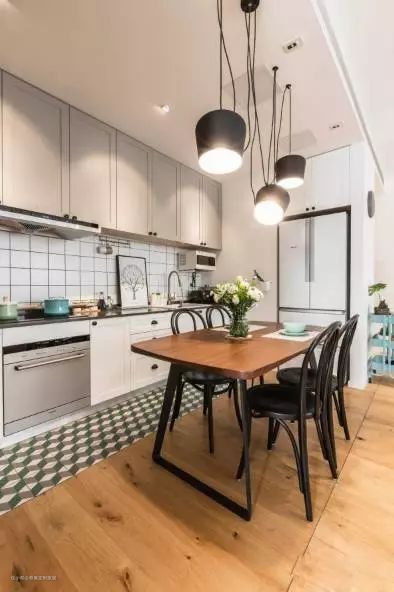 几何瓷砖与木地板无缝拼接,