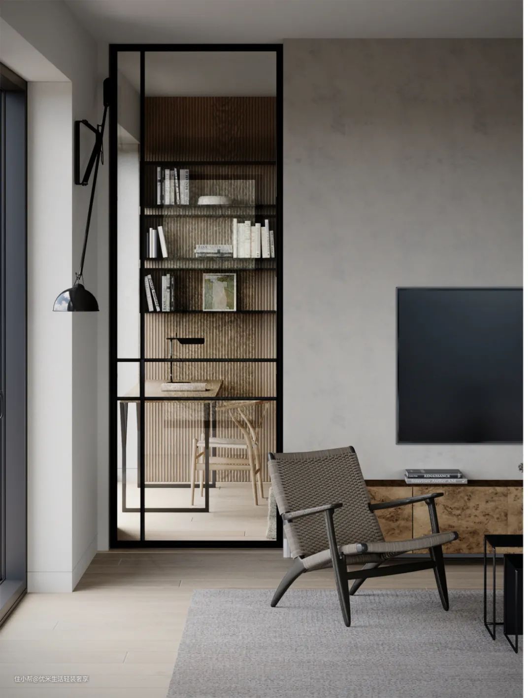 如果书房与客厅相邻,用玻璃隔断代替墙体能够让空间更加通透宽敞,同时能保有书房需要的安静和独立性。半墙加玻璃隔断的做法比较常见,也可以只在书房门上加入玻璃元素增加采光。