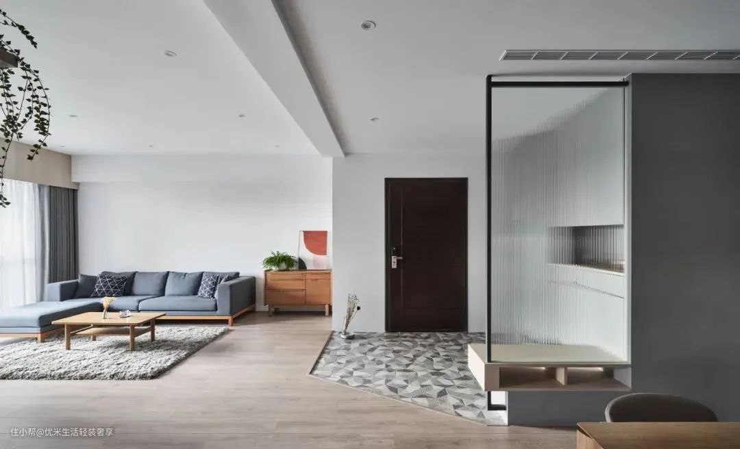在玄关和客餐厅之间使用玻璃隔断,一般是因为空间没有分隔开,在门口就能把客厅看的清清楚楚,视线无阻挡,俗称“开门见厅”。这时候就可以利用玻璃隔断来划分空间,既能保证玄关的独立性,又不会影响空间采光。