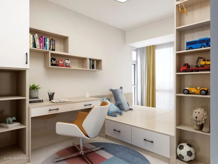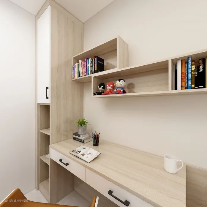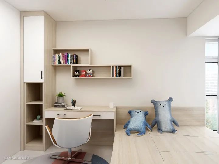 次卧:卧室采用榻榻米+衣柜+书柜+书桌的组合设计,并且该榻榻米设计并没有做成靠墙式,这样的好处是可以有一个落地窗户,而且在榻榻米与落地窗户的间隔空间定制了书柜,看书除了在书桌上,也可以在自然光下看哦。