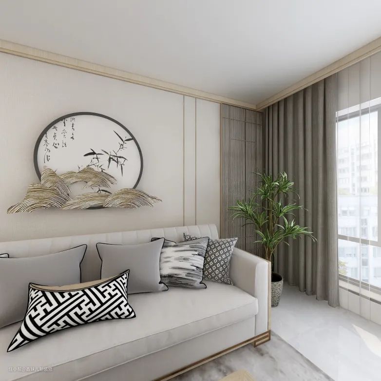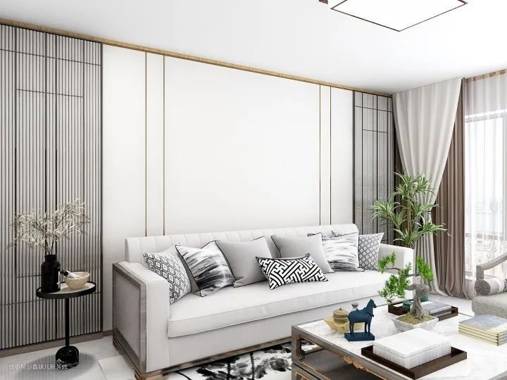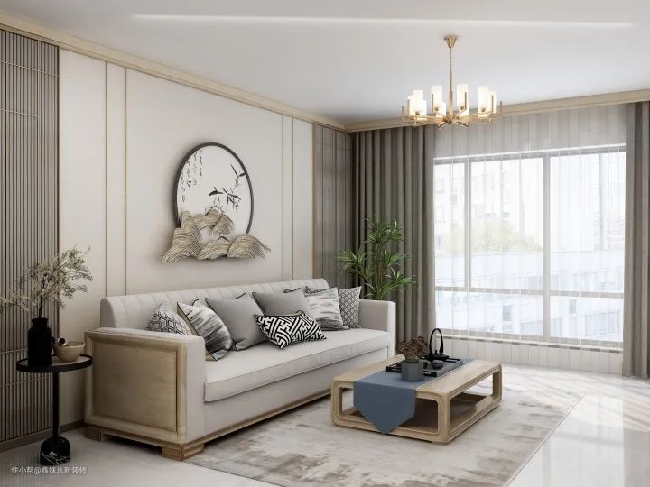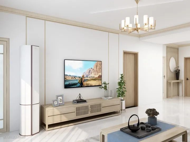 客厅中的电视柜、茶几、沙发背景都是新中式元素,整体设计搭配十分和谐。而且这样的设计一点不显拥挤,主要是因为设计上应用了化繁为简,从视觉上增加了空间宽阔感。