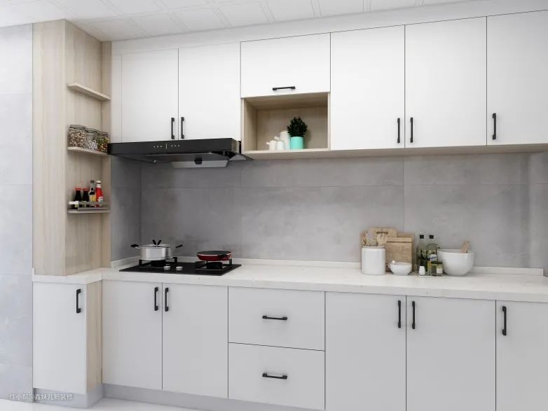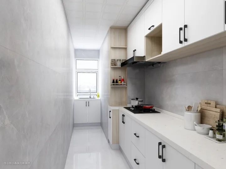 厨房比较狭长,所以整个空间宽度并不宽敞,所以只能采用一字型橱柜。对于一个家的后厨空间,它的作用自然是非常大的,空间虽小,五脏俱全。从效果图上可以看出,我们对橱柜进行了充分设计,可以做到充分的收纳,也因此将水槽放置在了窗台处,可以更加合理应用有限空间。