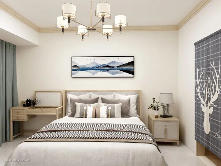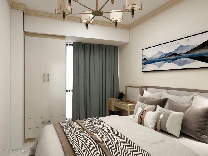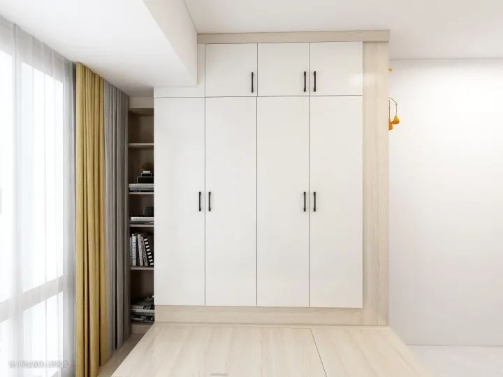 主卧:除去床的面积,我们需要对卧室仅剩不多的空间做好规划。省略了一个床头柜,增加了一个多功能梳妆台。并在窗户区域定制了一个柜门式衣柜,这个衣柜虽然不大,但是这样的衣柜非常实用,也是一直都受欢迎的经典衣柜形式。