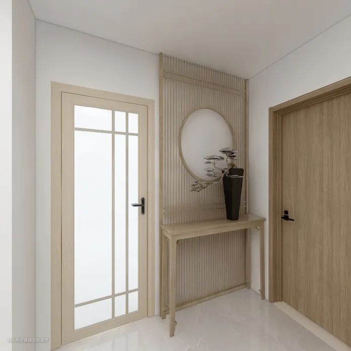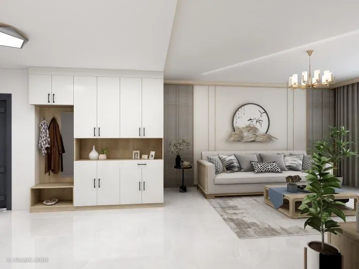 入户空间定做了一个入户柜,尽可能多的利用墙面面积,所以柜子做成了与天花板相连接。采用柜门开合,可以有效保证空间整洁;定制换鞋凳,以及开放式换鞋区、装饰区。因为考虑到实用性,所以整个柜子并没有新中式元素,而只是简约百搭风格,那么新中式要如何体现呢?
