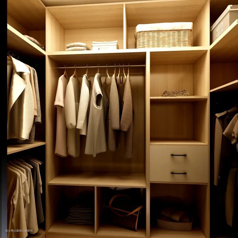卧室中有一道门帘,门帘之内别有洞天,也是女主人特别喜欢的区域——步入式衣柜。衣柜采用开放式,分为悬挂区和折叠区,上面部分为折叠区,中下部分为悬挂区,其中悬挂区按照衣物长短进行区分,这样的好处,可以节省时间,提高穿搭效率。有部分是开放区,如果担心有灰尘,可以再购置储物箱进行收纳也是不错的选择。