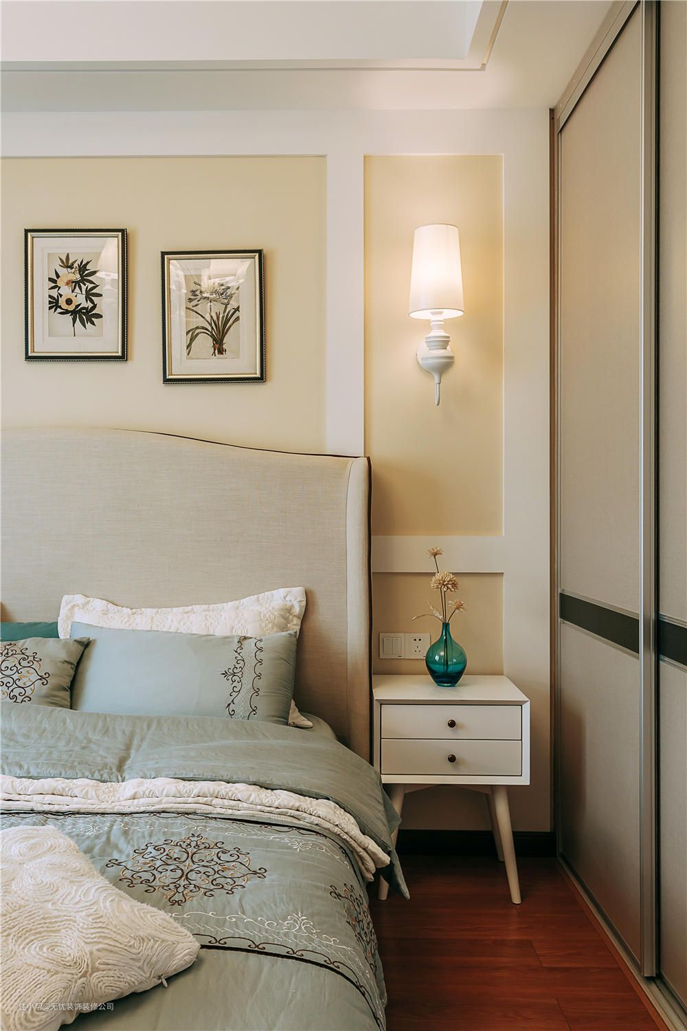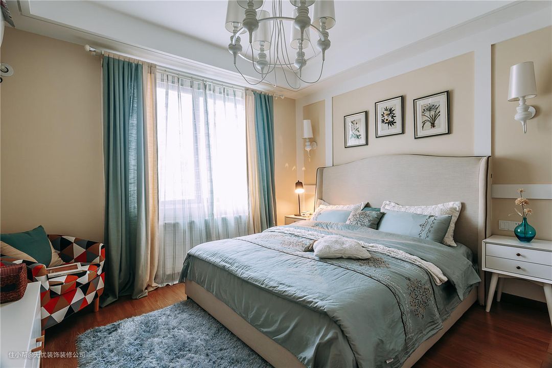 #卧室 #相比次卧室,主卧的空间功能性简化了许多。整体美式基调,清新自然偏女性的柔美,后现代的吊灯和壁灯,给人时尚科技感,窗帘和床的颜色搭配让整个房间显得娴静优雅。#主卧 #美式