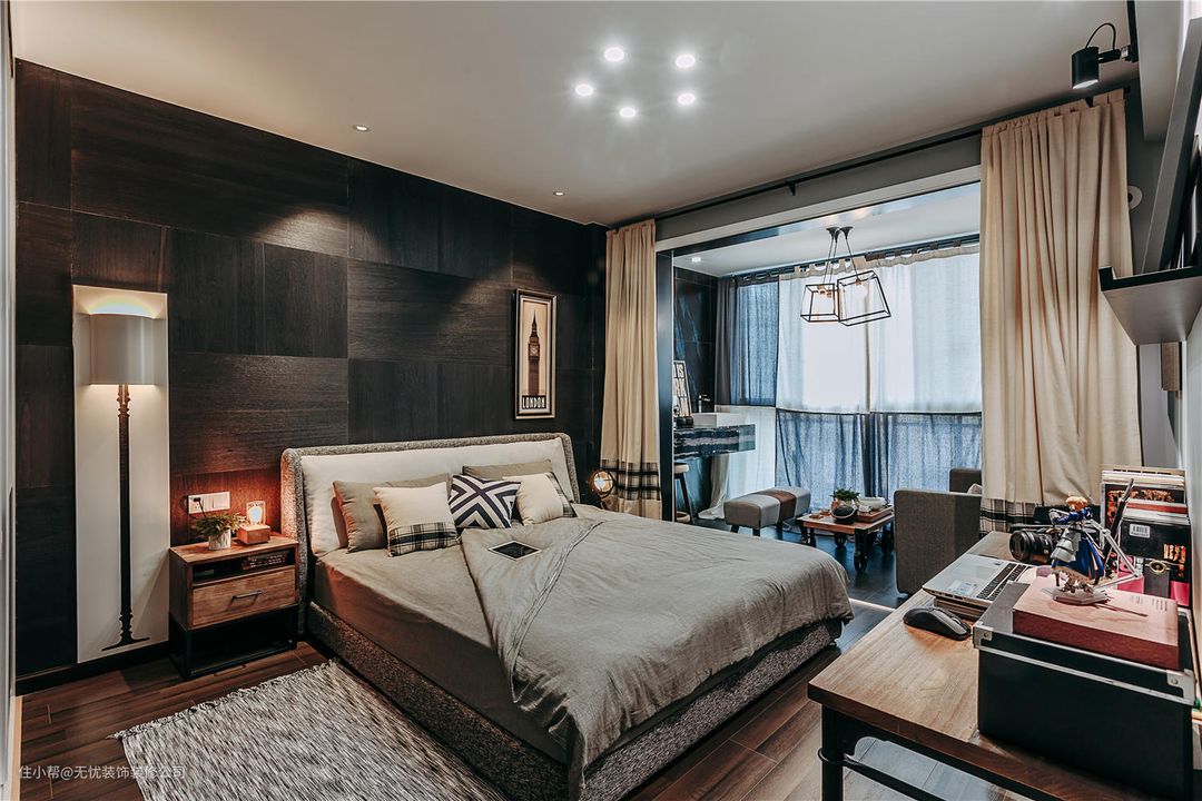 #卧室 #次卧一的墙面和地板以深色为主,配合暖色调的灯光,可以烘托良好的睡意,将主卧灯照镶嵌在凹部,不占据空间又有一番装饰美感。#卧室 #深色 #顶灯