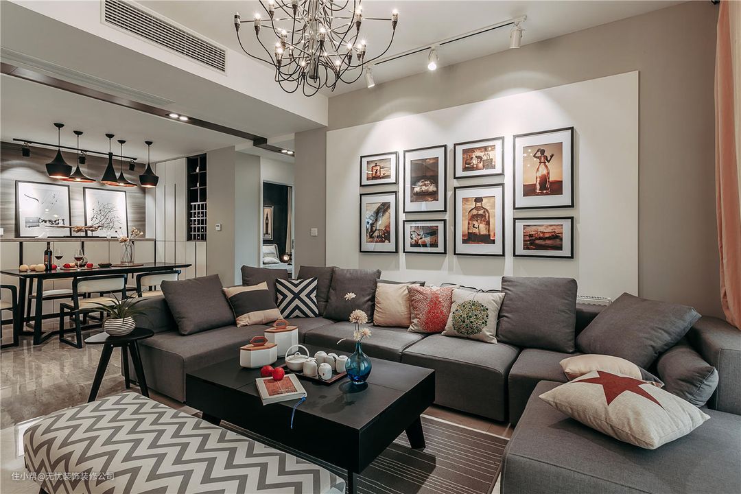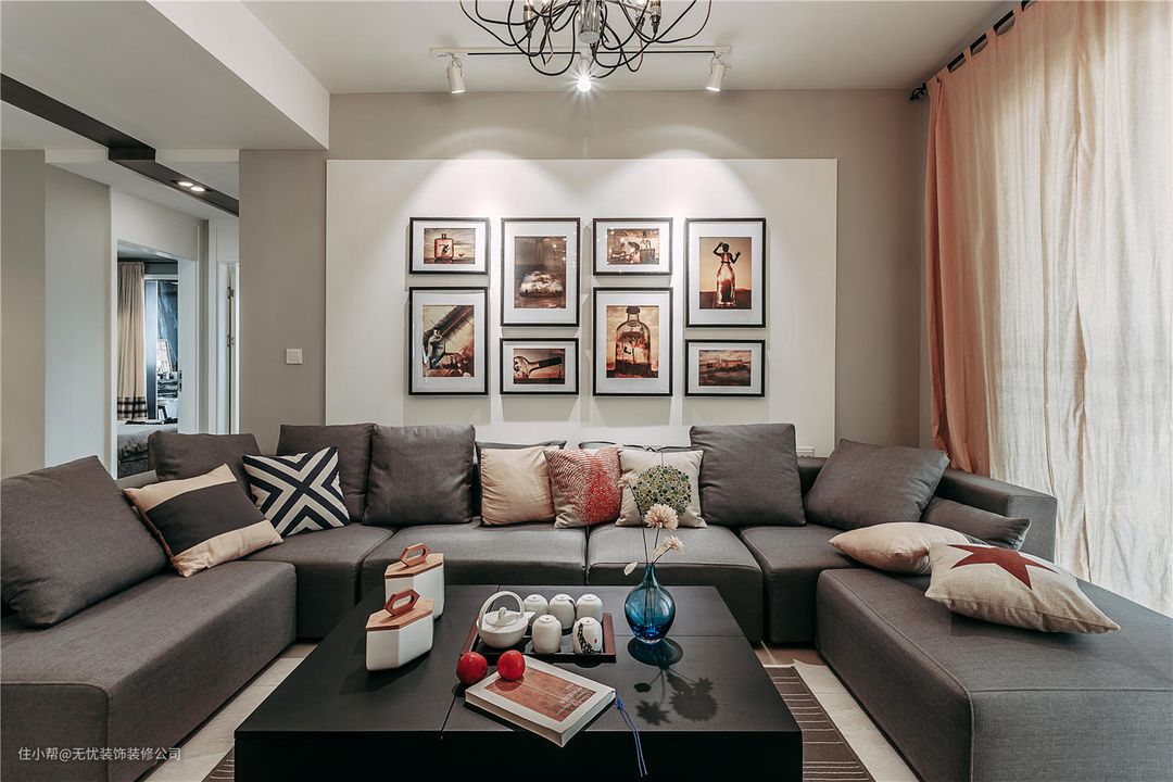 #客厅 #不同规格的摄影画组合在射灯照射下,视觉艺术感极强,黑色边框更显立体感,生活和艺术完美融合,缺一不可。围坐的布艺沙发特别温暖,纱质窗帘在良好隔音的同时给客厅营造出朦胧美感。#装饰画 #沙发背景墙 #布艺沙发