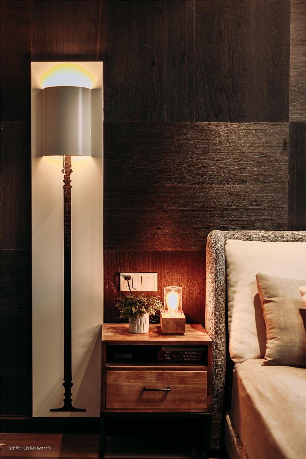 #卧室 #深色木纹质感的床头内嵌落地灯,恐怕只有设计师才敢这样做,凹龛里的深色暖光,如暗黑壁炉的火焰给人温暖、催人入眠。#床头背景墙